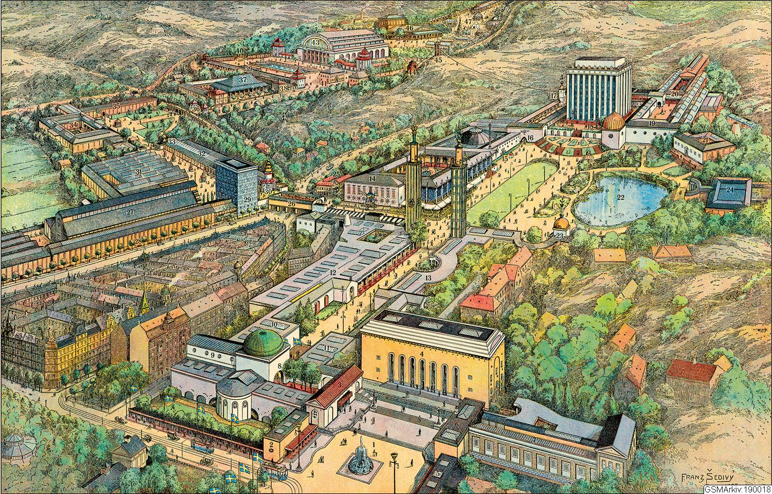 Färgbild över området med Jubileumsutställningen mot söder. I bildens nederkant Huvudentrén och Konstmuseet vid Göta Platsen. Till vänster utställningshallar för Exportutställningen och Liseberg. Mitti bild den 2 torn, Minareterna mellan historiska utställningen och Minneshallen högst upp i bild. Till höger om Minneshallen ligger utställningarna för Konstindstri och Hantverksamt för Idrott.