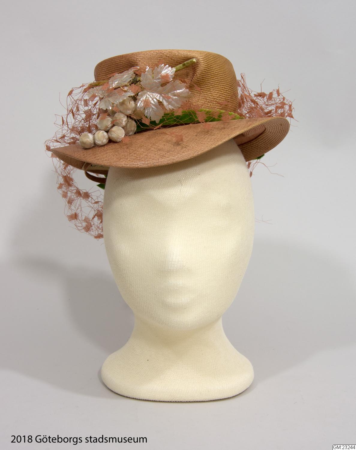 - Från katalogkort: Damhatt av stråfläta i brun/rosa färg. Kullen hög med framtill nersydda veck; brättet nerböjt fram och bak. Garneringen består av flor i hattens färg, grön sammetsrullå runt kullen avslutad med fyra ändar samt placerad över dessa och mitt fram en kvist med vita bär och silveraktiga blad. Nackband av stråfläta och kantband av brunt rips. Firmamärke: Odette Colson, 16 Rue de la Paix - Paris, 1939, F.W.H., C.R.