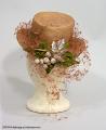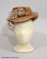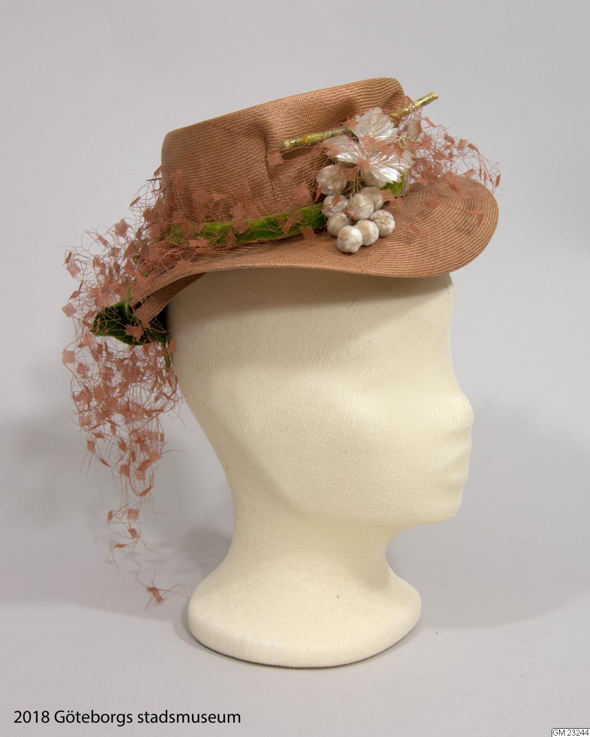 - Från katalogkort: Damhatt av stråfläta i brun/rosa färg. Kullen hög med framtill nersydda veck; brättet nerböjt fram och bak. Garneringen består av flor i hattens färg, grön sammetsrullå runt kullen avslutad med fyra ändar samt placerad över dessa och mitt fram en kvist med vita bär och silveraktiga blad. Nackband av stråfläta och kantband av brunt rips. Firmamärke: Odette Colson, 16 Rue de la Paix - Paris, 1939, F.W.H., C.R.