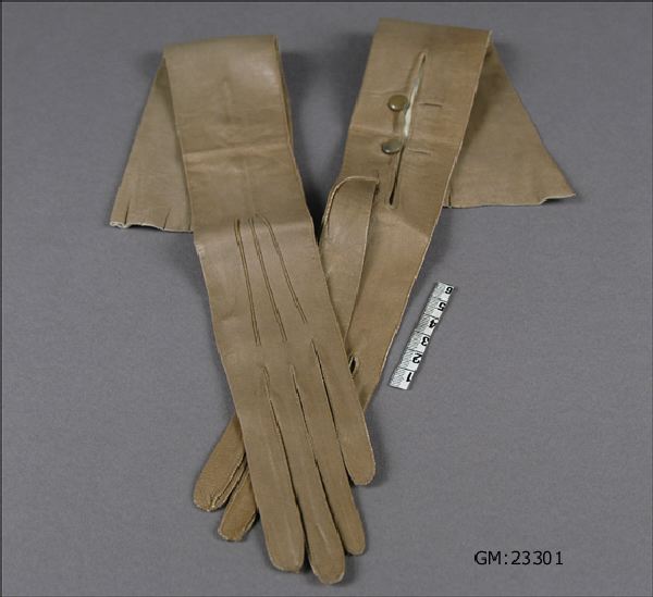 - Från katalogkort: Handskar för dam, ett par. Helskinn, armbågslångmodell av glacé, grå-beige. Knäppes med två knappar och knapphål i en 11,5 cm lång slits. Rundsömmar. Längd: 45 cm. Stämpel i ena handsken; 5.3, 10:-.