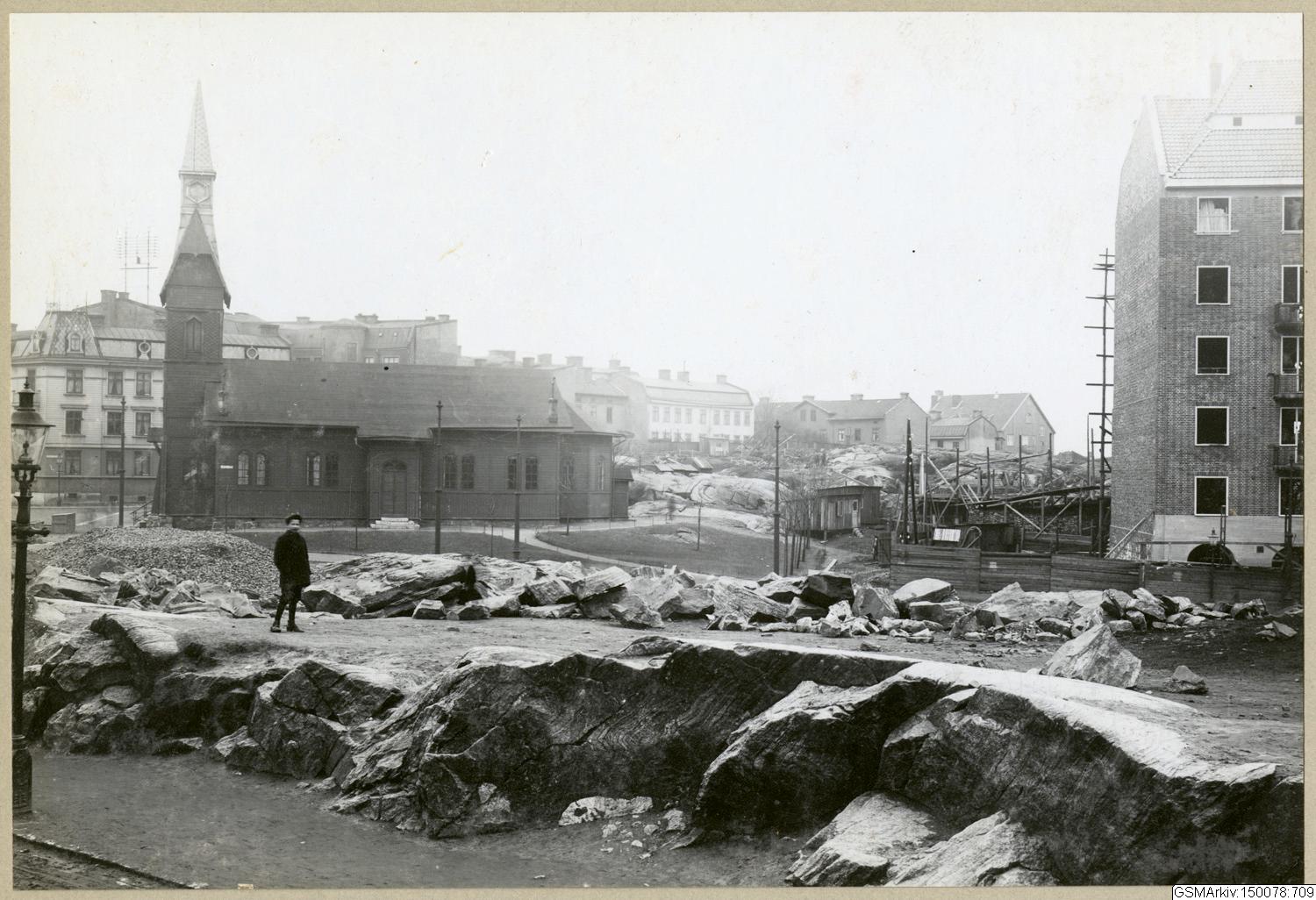 - Kapellplatsen 4 April 1914. I fonden Erik Dahlbergsgatan. På bilden syns Landala kapell på sin ursprungliga placering hörnet av Erik Dahlbergsgatan och Kapellgatan (1919 fick det sin nuvarande plats vid Kapellgången).