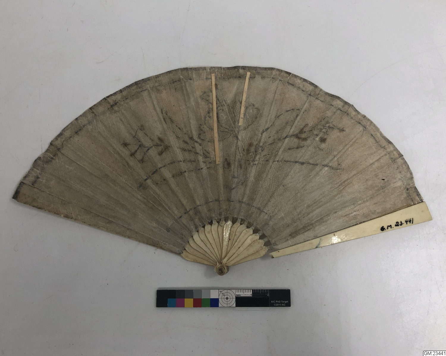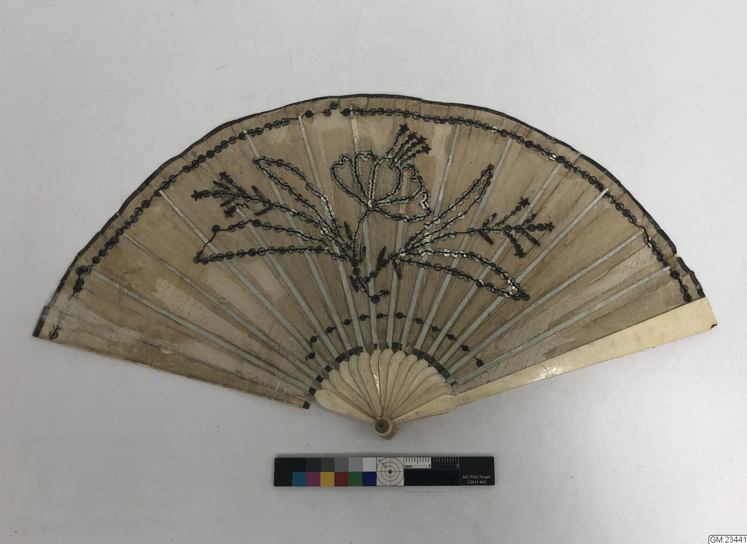 Solfjäder med spröt av elfenben och skärm av siden med broderade stålpaljetter. Solfjädern har lagats genom att skärmen har dubblerats med papper och går ej att fälla ihop.