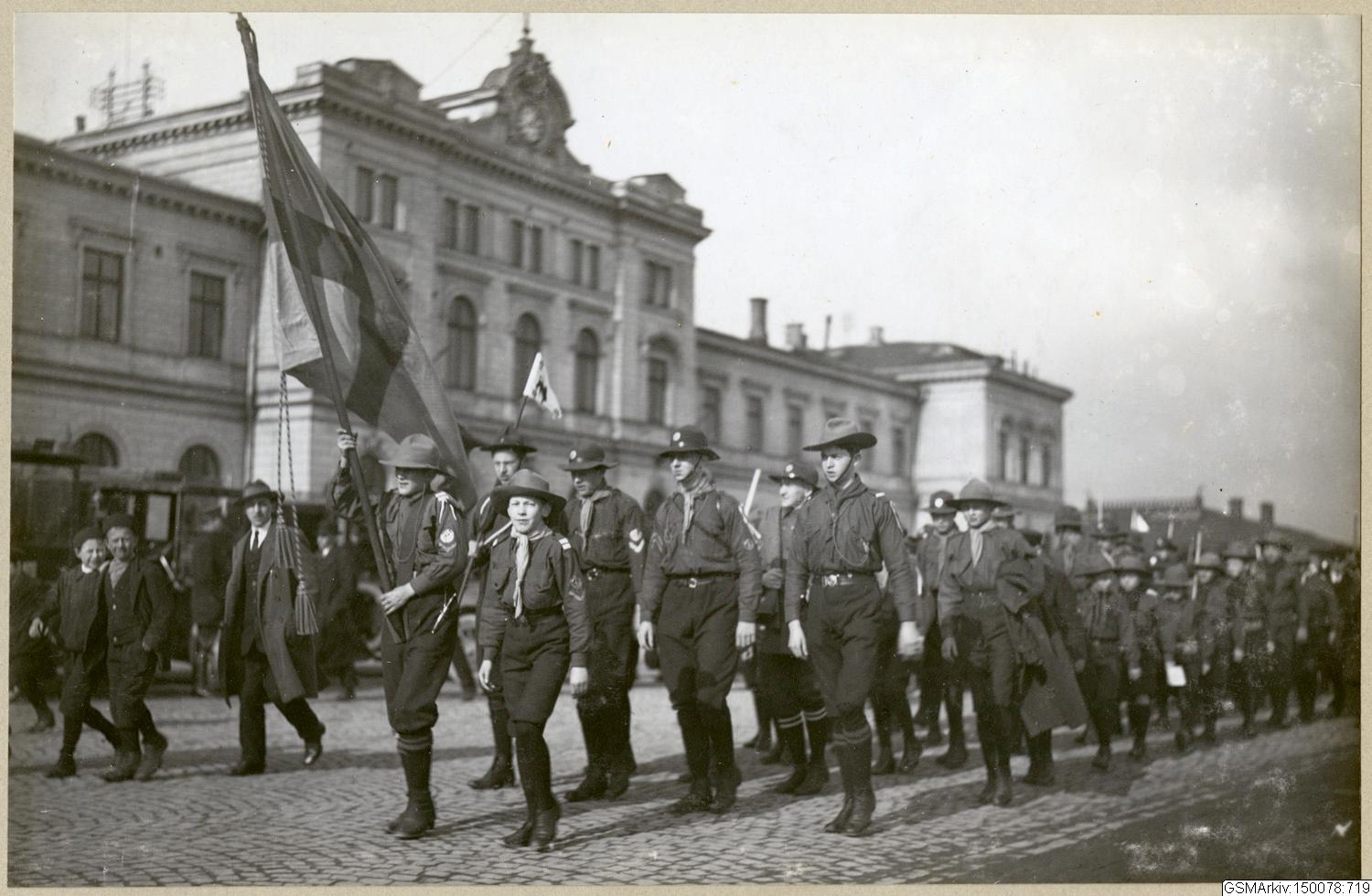 - Karlstadsscouter på väg till Latinläroverket. d. 10 April 1914.