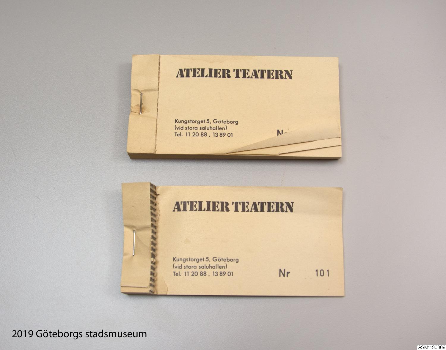 Två biljetthäften från Atelierteatern. Det ena är oanvänt och det andra har några avrivna biljetter.