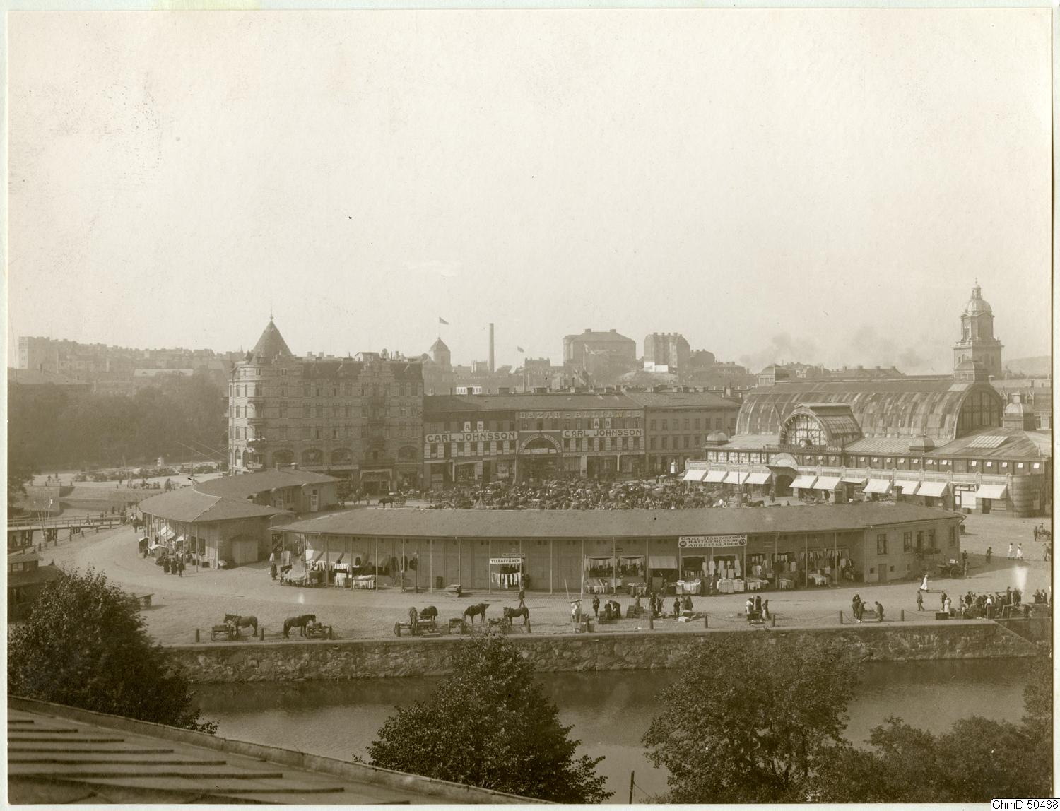 Vy över Kungstorget med Kungstorgsbasaren och Saluhallen. I fonden Stora och Lilla Otterhällan.