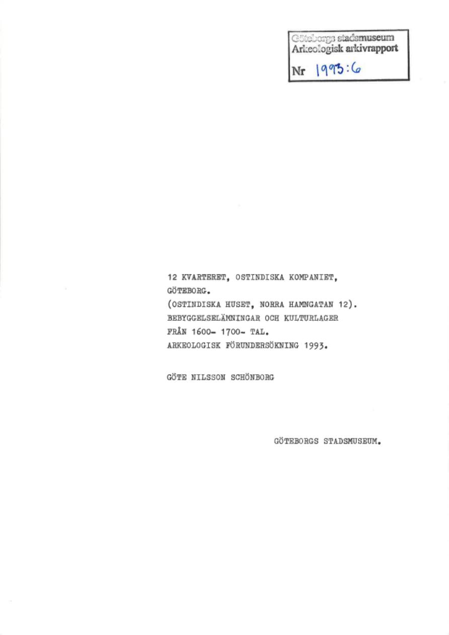 12 kv Ostindiska kompaniet, Göteborg : (Ostindiska huset, Norra Hamngatan 12) : Bebyggelselämningar och kulturlager från 1600- 1700-tal : Arkeologisk förundersökning 1993 / Göte Nilsson Schönborg.- Göteborg, 1993