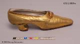 Damskor av fögyllt läder, med spännen av gulmetall. Halvhög, svängd klack. Fodrade med vitt skinn baktill. L:25,5 cm. Hör till klänning från 1907, GM:23881, buren av fru Bertha Nyström. (Strumpor i guldgul färg hörde till denna dräkt).