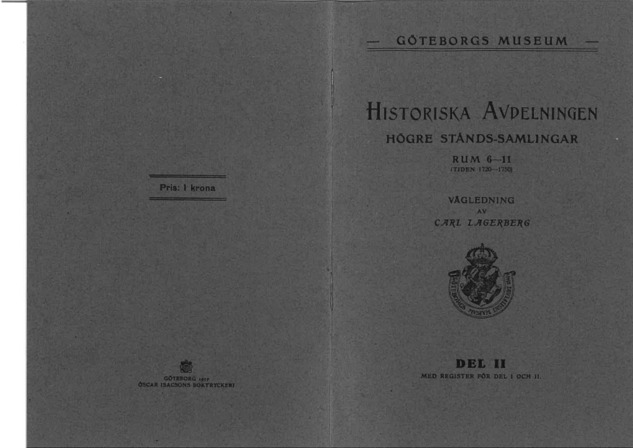 Göteborgs museum : historiska avdelningen, högre stånds-samlingar : vägledning. D. 2; Rum 6-11 : (tiden 1720-1750) / av Carl Lagerberg.- Göteborg : Museet, 1917