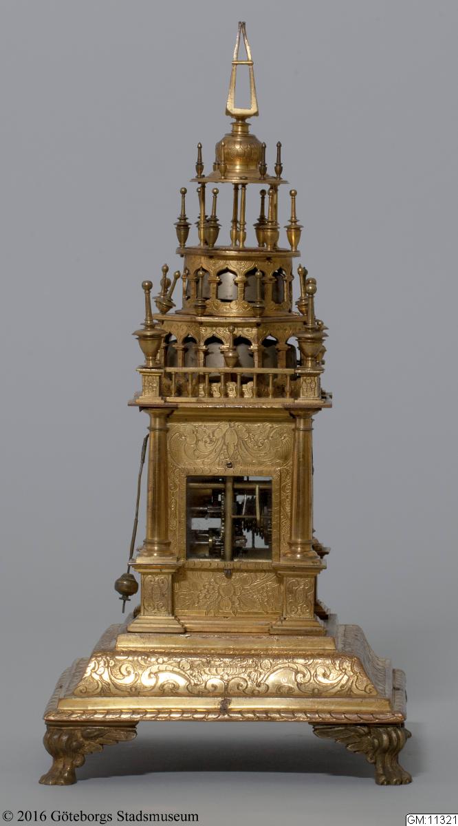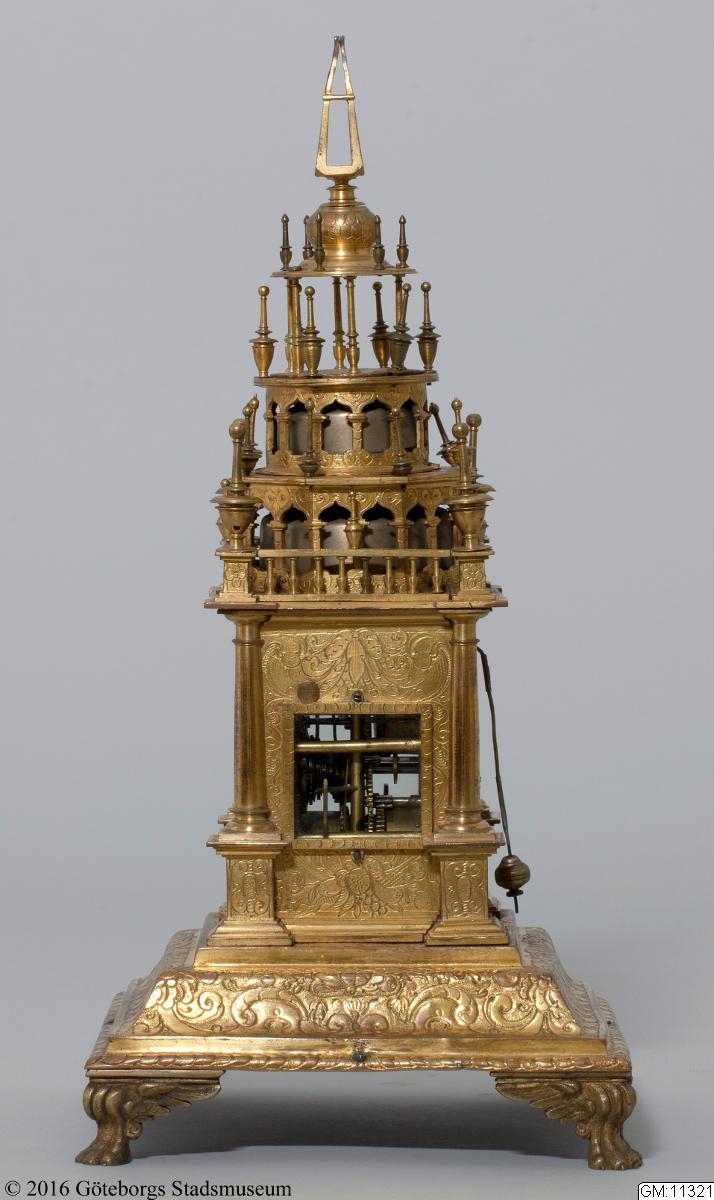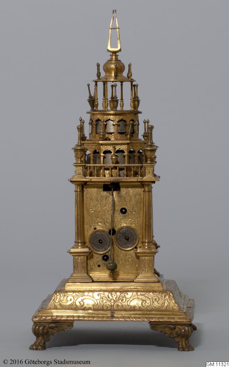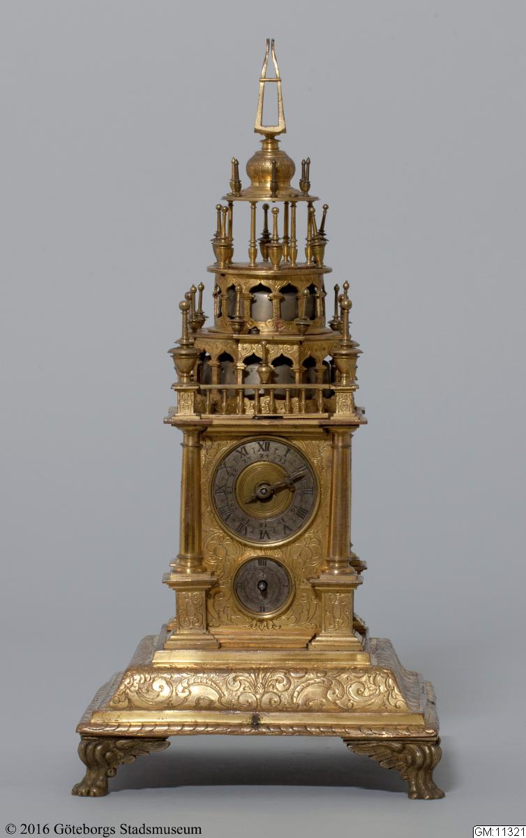 - Ur i form av ett torn; rikt graverat, ciselerat och med en brännförgylld yta. Ett typiskt praktföremål från 1600-talet, då man gärna försåg dessa lyxföremål med ett praktfullt yttre som skulle imponera på betraktaren och förmedla känslan av välstånd. GM:11321