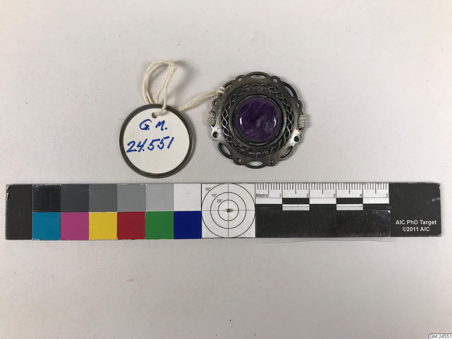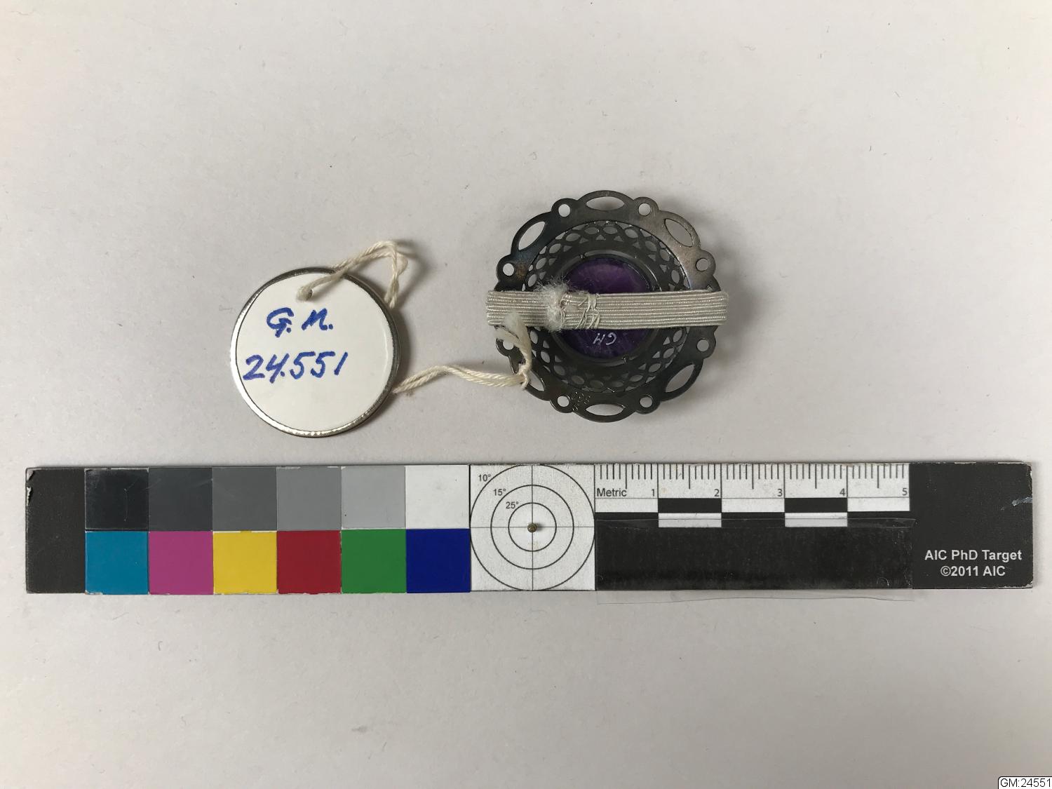 - smycke rund silverskiva med genombrutet mönster och violett sten i mitten. Brukaren har trätt resår genom två avlånga hål på motsatta ändar av smycket, resåren har sedan sytts ihop. Möjligen för att kunna använda den som fäste för ändarna av en hals-scarf.