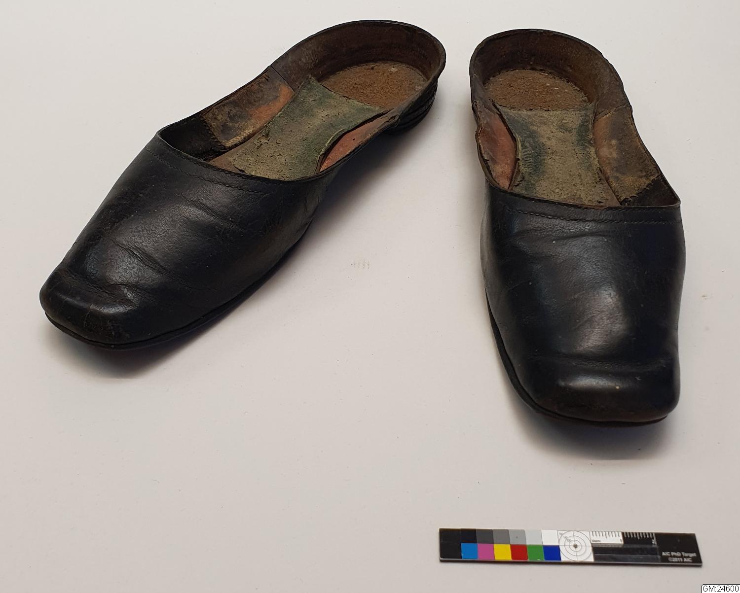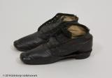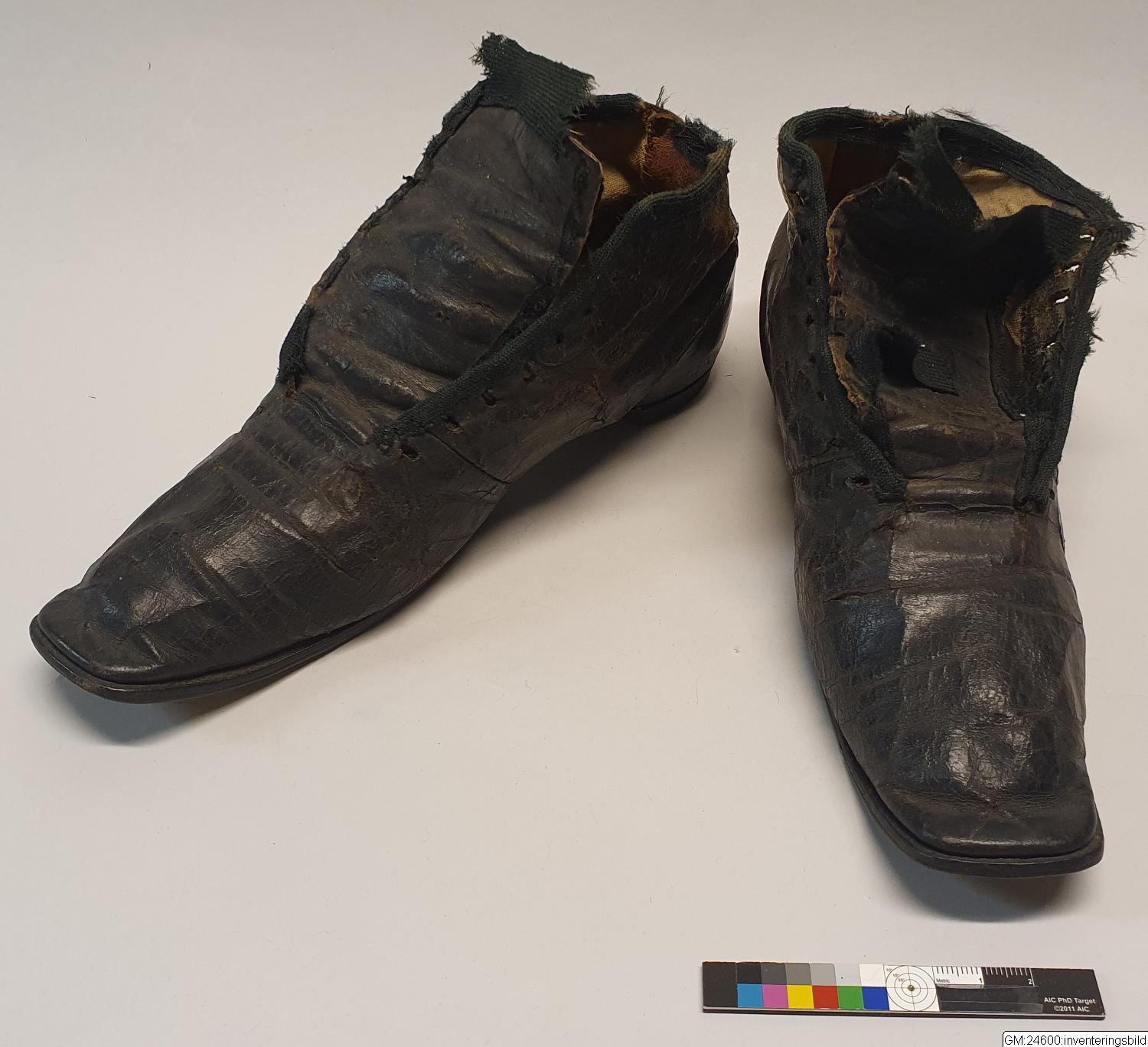 Snörkängor för dam, ett par, med galoscher. Svart läder. Över benet klädd med kantband. Grovt yllefoder. Kantig tåhätta. Låg klack. 1860-talet. Längd 24 cm, bredd 6 cm, höjd 6 cm.