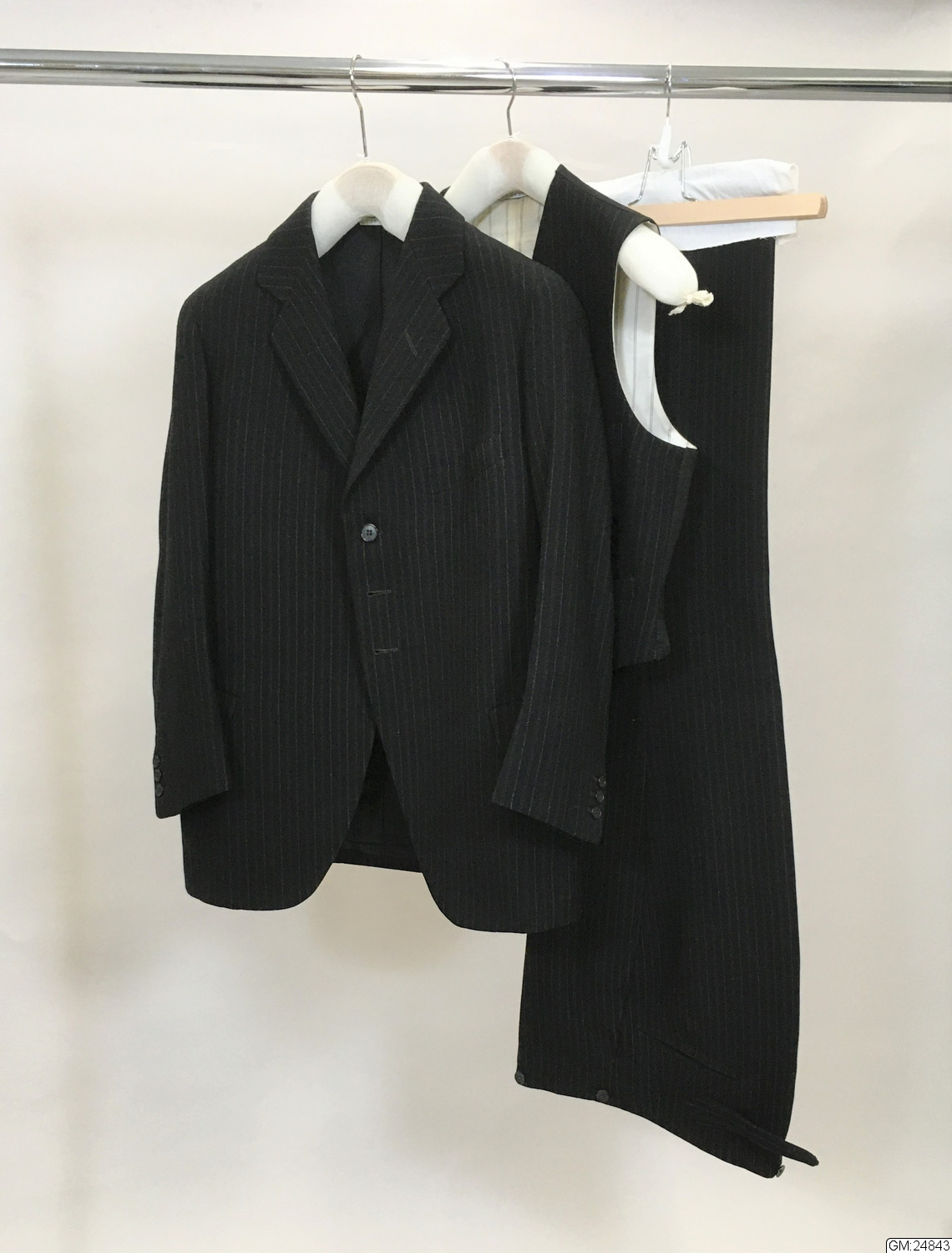 Herrkostym av svart ylle med smala vita ränder bestående av kavaj, väst och byxor. Märkt Henry Törnsten & Co på knapparna.