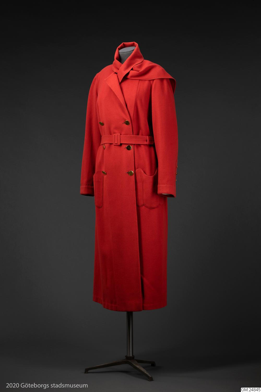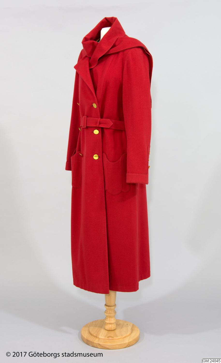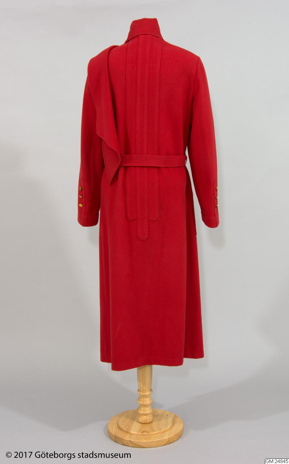 Damkappa av rött ylle. Krage med scarf, 2 utanpåfickor. Sytt skärp med klätt spänne. Dubbelknäppning med tre rader knappar i guldförgyllning. Tre mindre prydnadsknappar på ärmarna. Sydd hos Augusta Lundin.