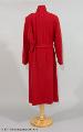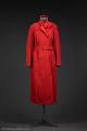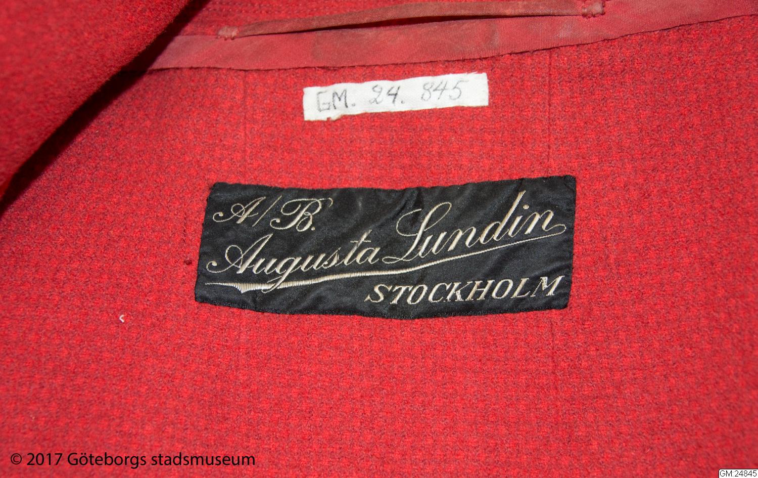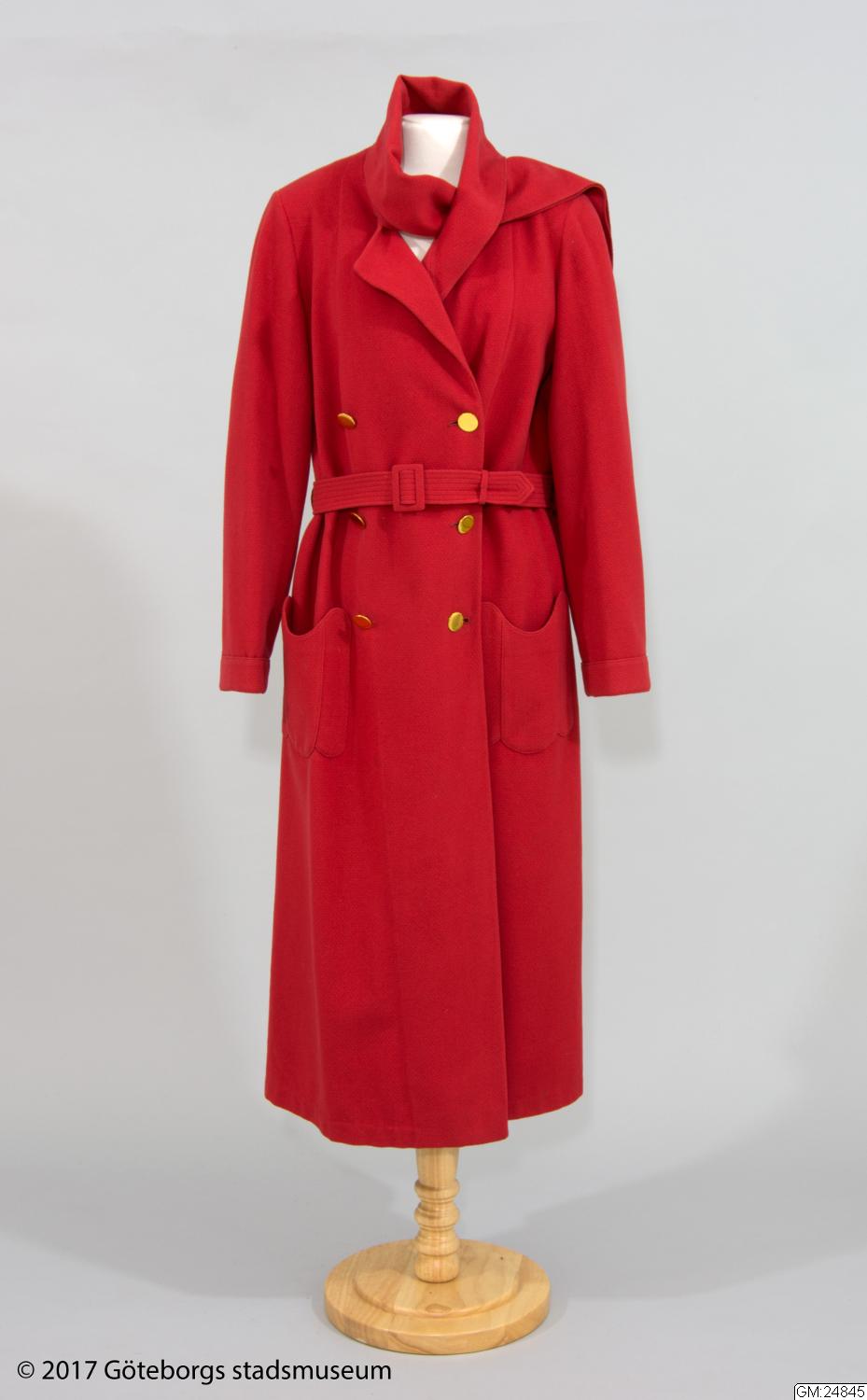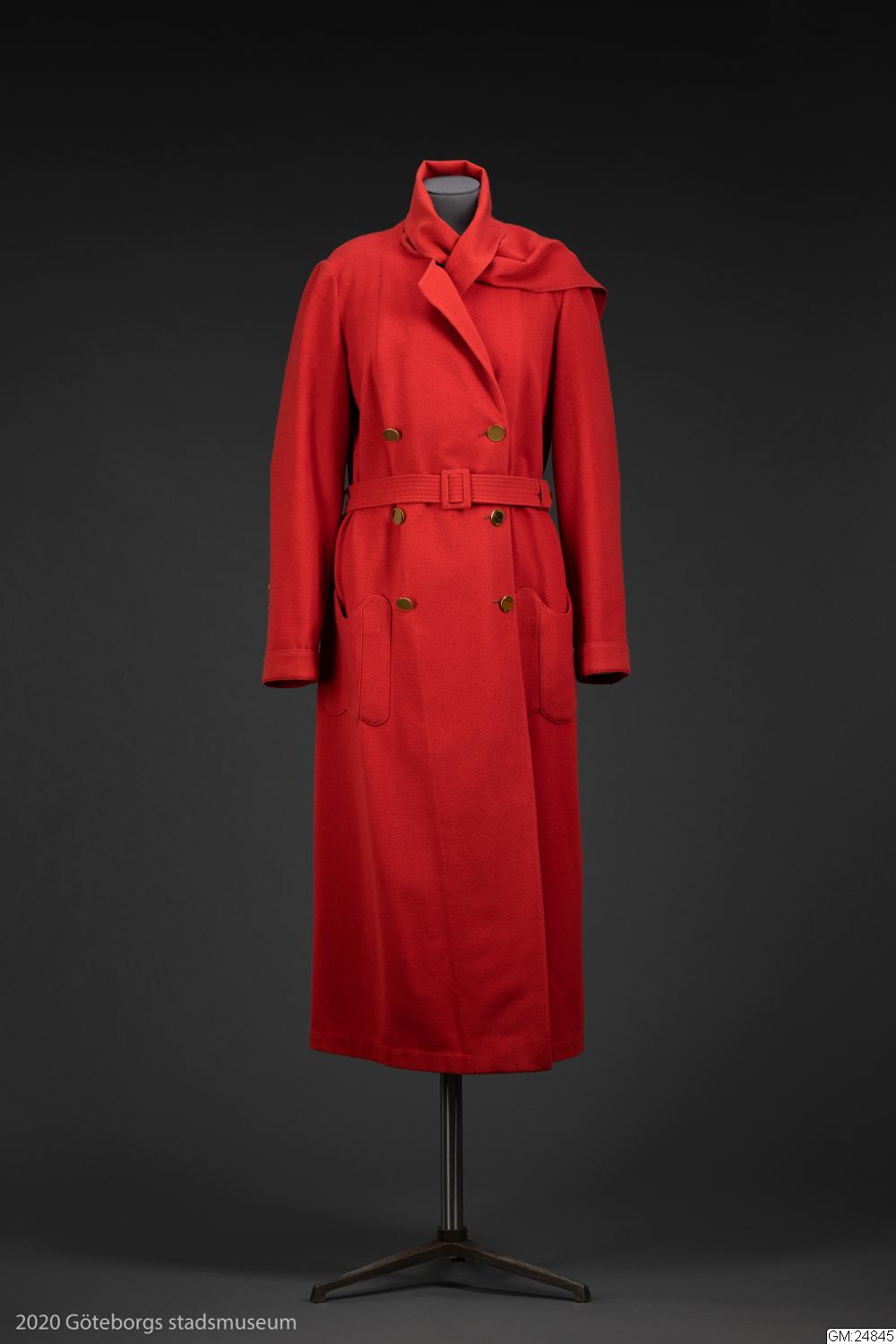 Damkappa av rött ylle. Krage med scarf, 2 utanpåfickor. Sytt skärp med klätt spänne. Dubbelknäppning med tre rader knappar i guldförgyllning. Tre mindre prydnadsknappar på ärmarna. Sydd hos Augusta Lundin.