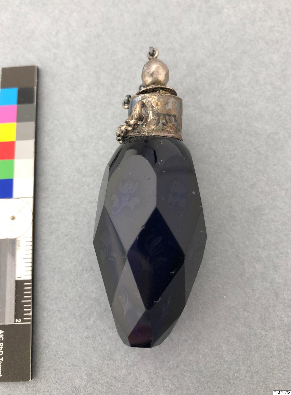 "Luktflaska af blått glas, beslag och propp m. vidhängande kedja af silfver" [enl. liggaren]