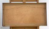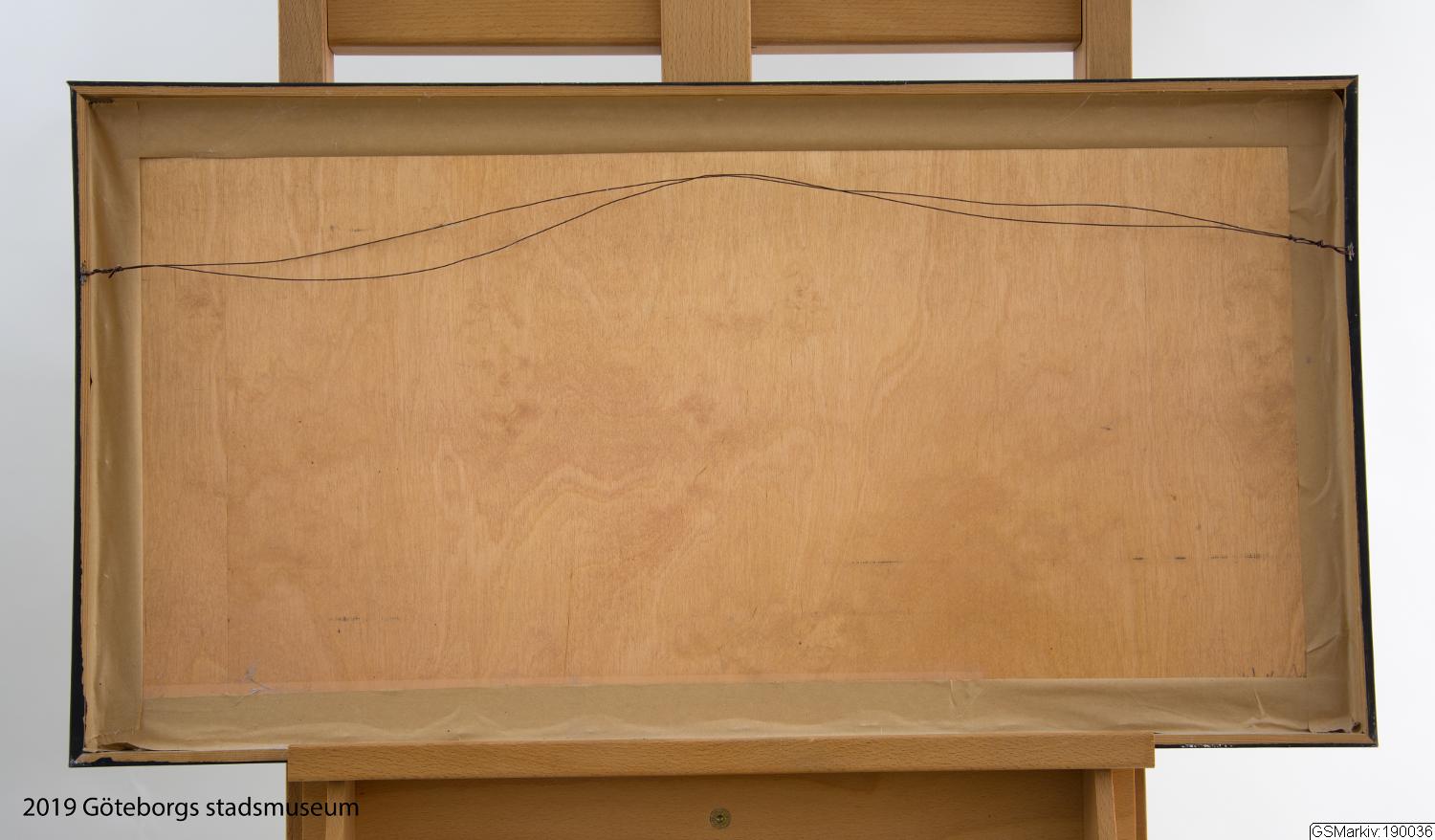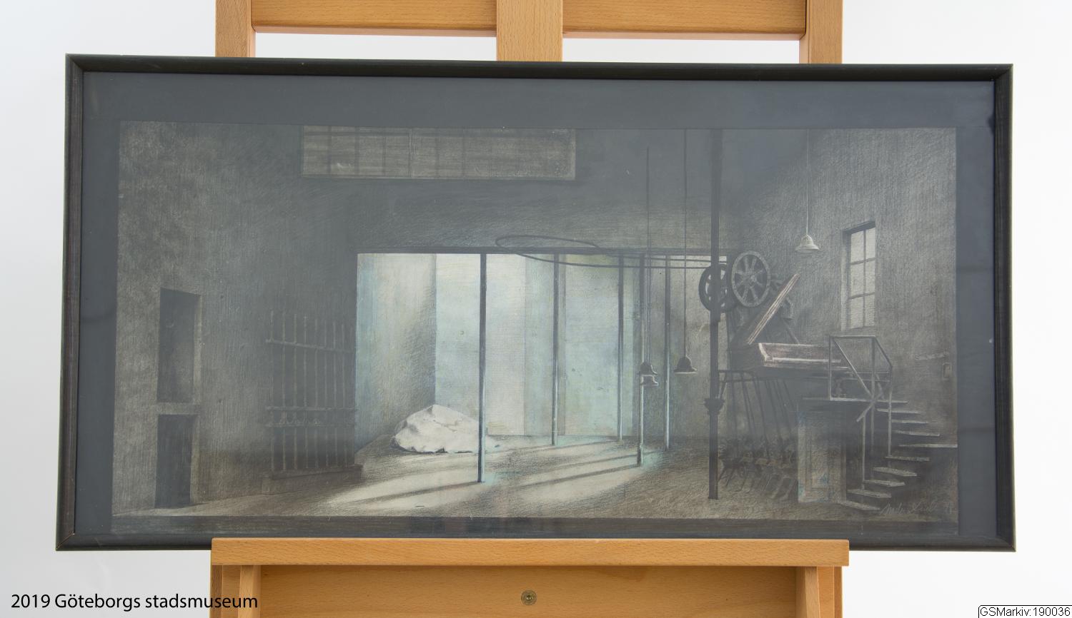 - En inramad scenskiss tillverkad av Jindrich Dusek till föreställningen Död mans hand, 1978. Skissen är i blyerts, pastell och färgpennor och monterad bakom glas med en svartmålad träram.