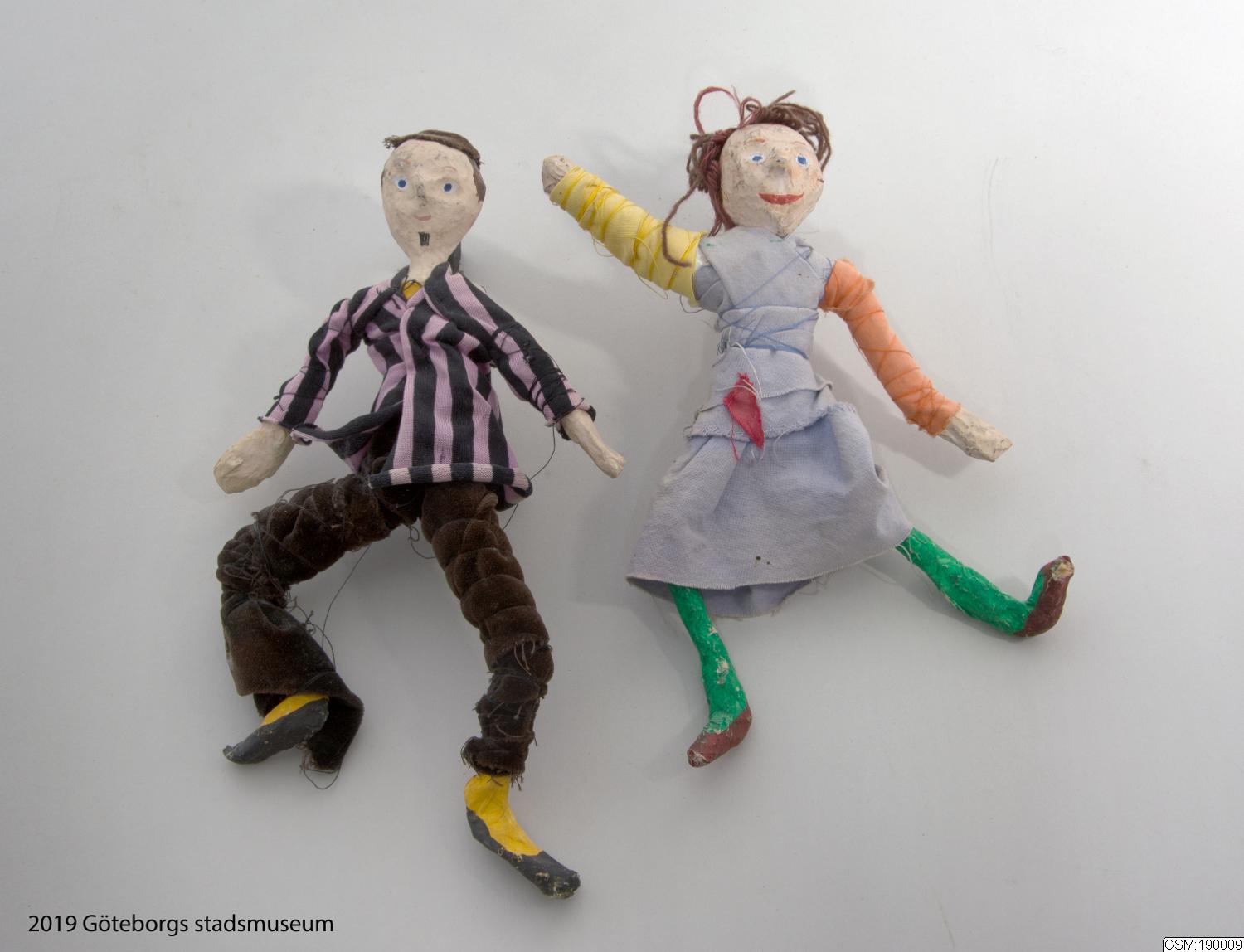 Två dockor i ståltråd, lera och tyg föreställande karaktärerna Krakel spektakel och Kusin vitamin ur Folkteaterns uppsättning av Krakel Spektakel 1985.