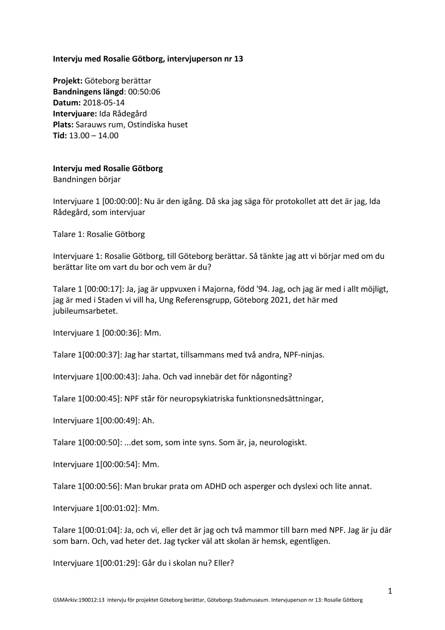 Hon känner sig väldigt göteborgsk. Släkten är från Göteborg – hennes farfar var präst i en missionsförsamling och bytte då efternamn till Götborg eftersom flera hade samma efternamn. Flera är konstnärer och artister. Pappan pratar mycket göteborgska och skämtar mycket. Göteborgsandan tycker hon är: Eldsjälar som inte ger upp, de möter hon i föreningarna där hon är med, men också den grova humorn. Hon rör sig mellan olika institutioner och hemmet och till Hisingen och åker då spårvagn. Går på föreläsningar och olika aktiviteter som finns i staden. Tycker om Göteborg förutom välfärden (de sociala institutionerna?) och där finns det ett motstånd. Det är inte lätt att göra saker heller om man har väldigt lite pengar. Människor glider isär.