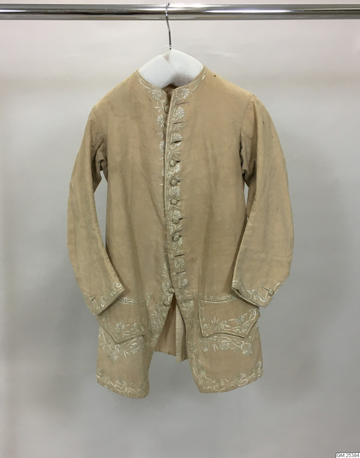 Av rosabeige linne m. foder i ljusare och grövre material. Söm mitt bak. Skört med mitt- och sidosprund, framtill svängt. Fickor på höften med snibbskurna lock. Enkelknäppt upp till halsen med små knappar överklädda med linnetråd. Ärmar med sprund m. knapp och knapphål. Utmed framstyckenas kanter, på manschetterna, samt utmed och ovanpå ficklocken blomrankor i plattsöm i ljust beige linne. Skick: Mycket gott.