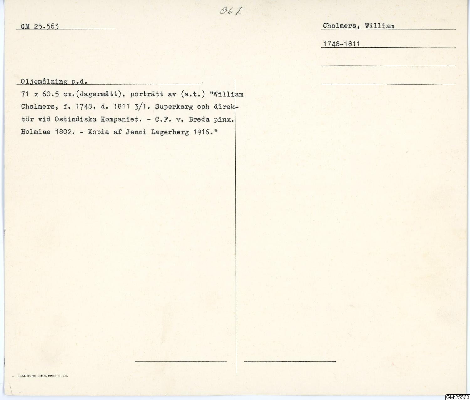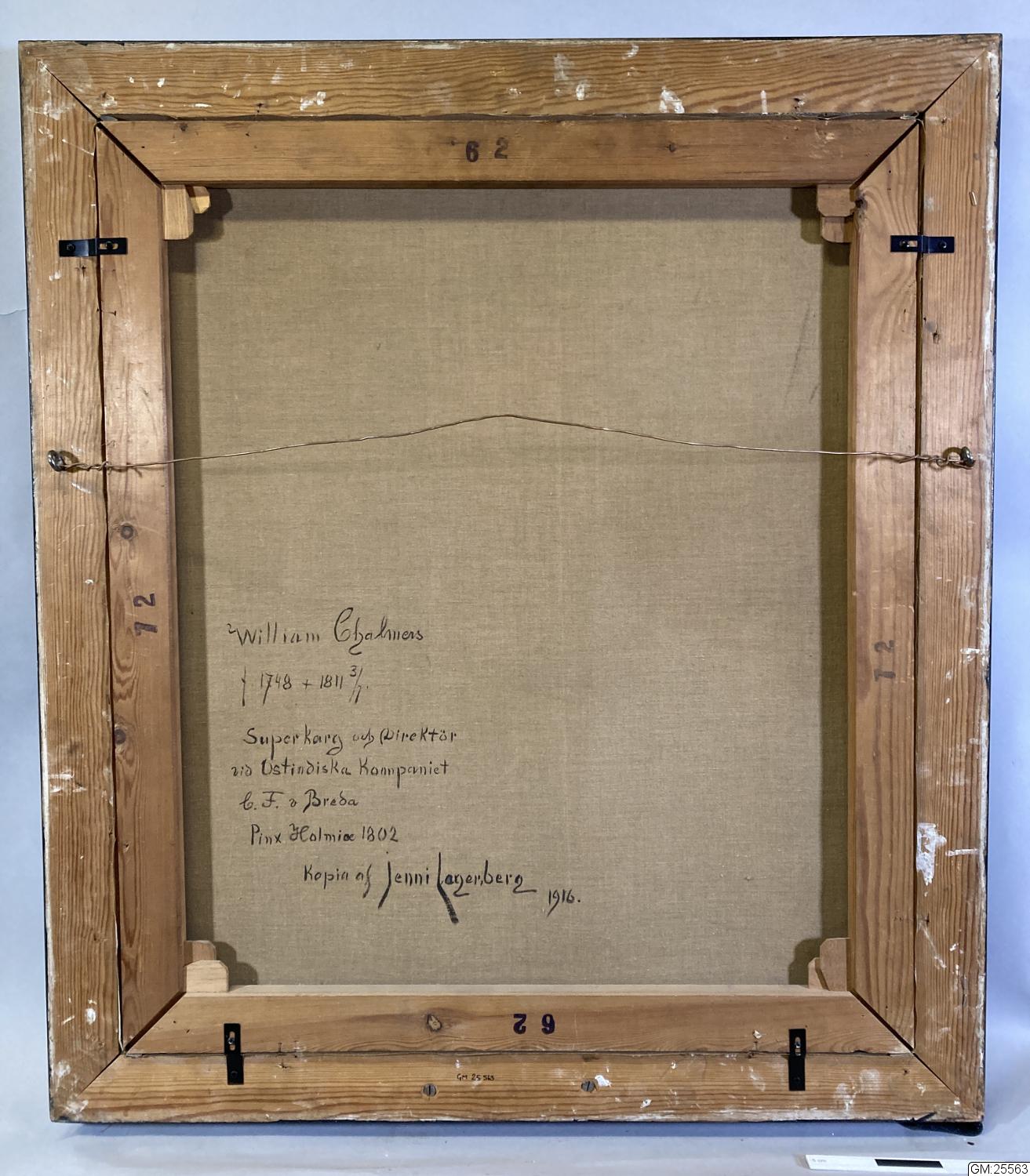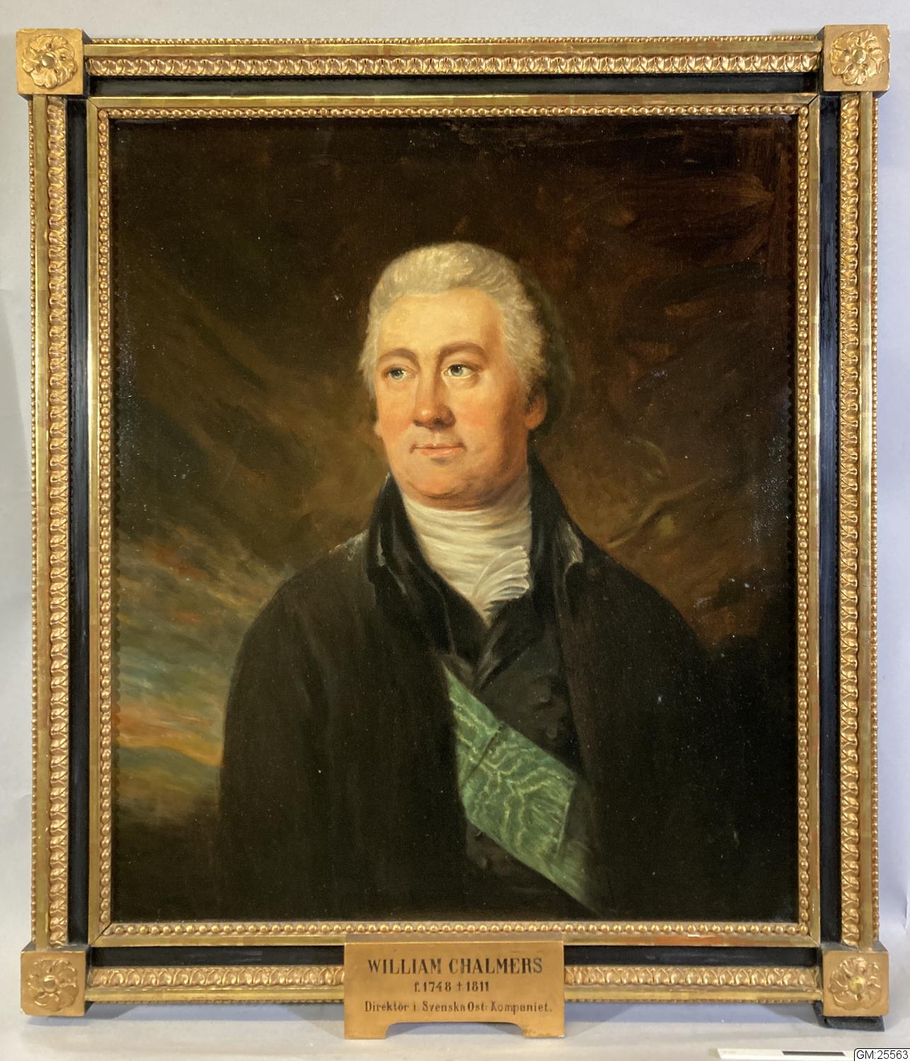 föreställande William Chalmers, med förgylld ram C.F von Breda-Pinx Holmiae 1802. Tidigare utan nummer i samlingarna, konserverad 1968 med pengar från fond.