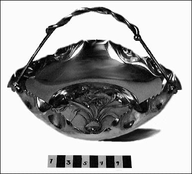 - Kakfat, fyrkantigt av nysilver. Kanten lätt inåtböjd och vågad samt dekorerad med grupper av små veck. Botten med gjuten dekor: påskliljor. En grepe från hörn till hörn, bestående av två spröt sammansnodda på mitten. Jugend