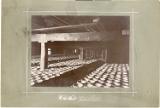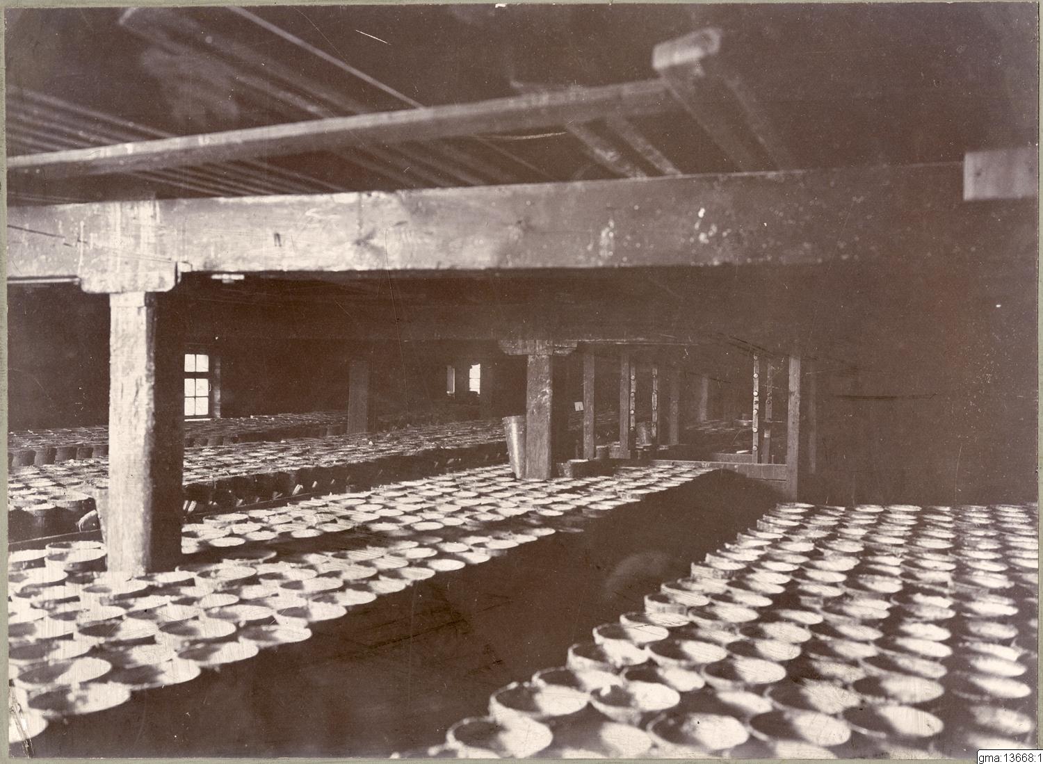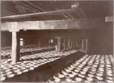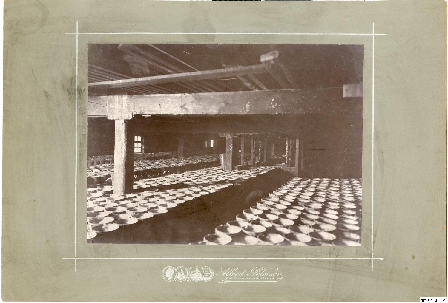 Från Carnegiska sockerbruket, toppsockertillverkning, i lokalen står gjutformar av bleckplåt med spetsen nedåt, fyllda med socker.