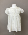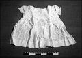 - Flickklänning. Midjevidd 28 cm. Vidd nedtill 156 cm. Av vit voile med spetsgarnering. Stor krage med hål för ärmarna. I halsringningens spetskant är trätt ett ljusblått smalt sidenband,