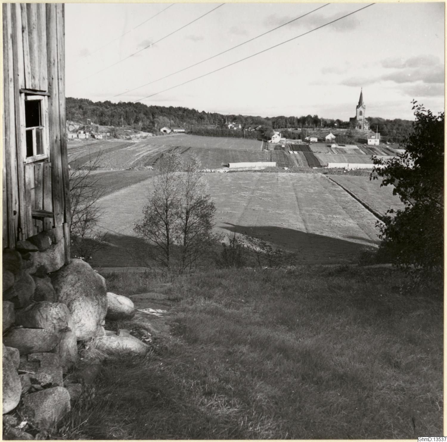 - Vy från Rud mot Västra Frölunda kyrka med omgivnade odlingslandskap.