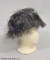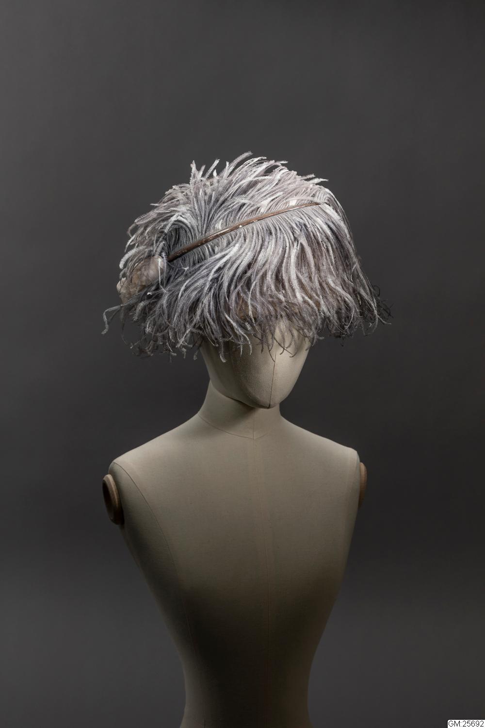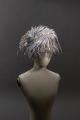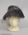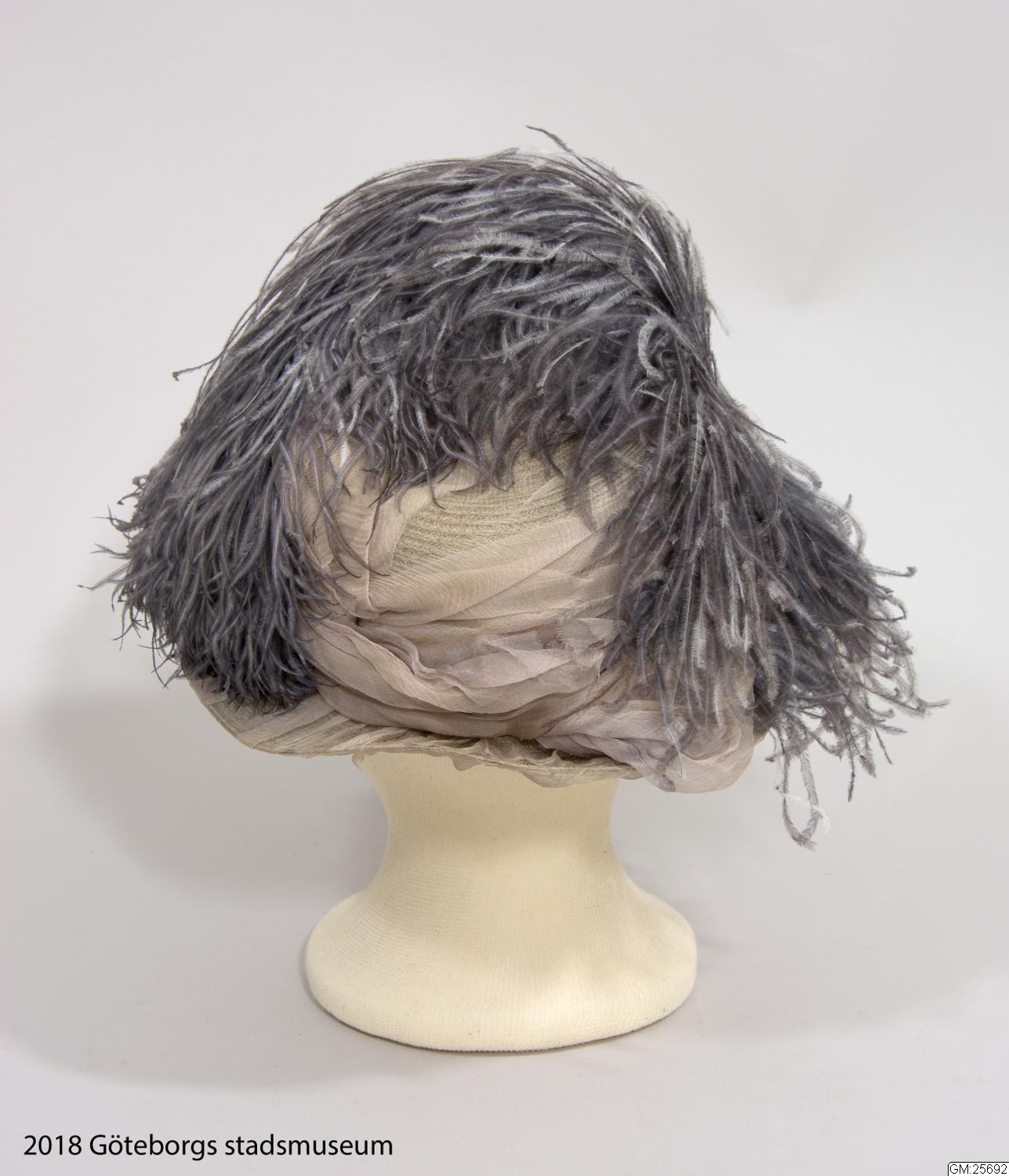 - Från katalogkort: Damhatt; 6 cm hög, platt kulle. 4-5 cm brett brätte, framtill sluttande, baktill uppåt böjt. Av ljusgrå stråfläta draperad med ljusgrå chiffong och prydd med en stor grå strutsfjäder som täcker hattens främre parti. Fodrad med crémevit chaponsiden. Firmamärke "Modes Aug:a Landbergs Eftr. Göteborg". Diameter 30 cm.
