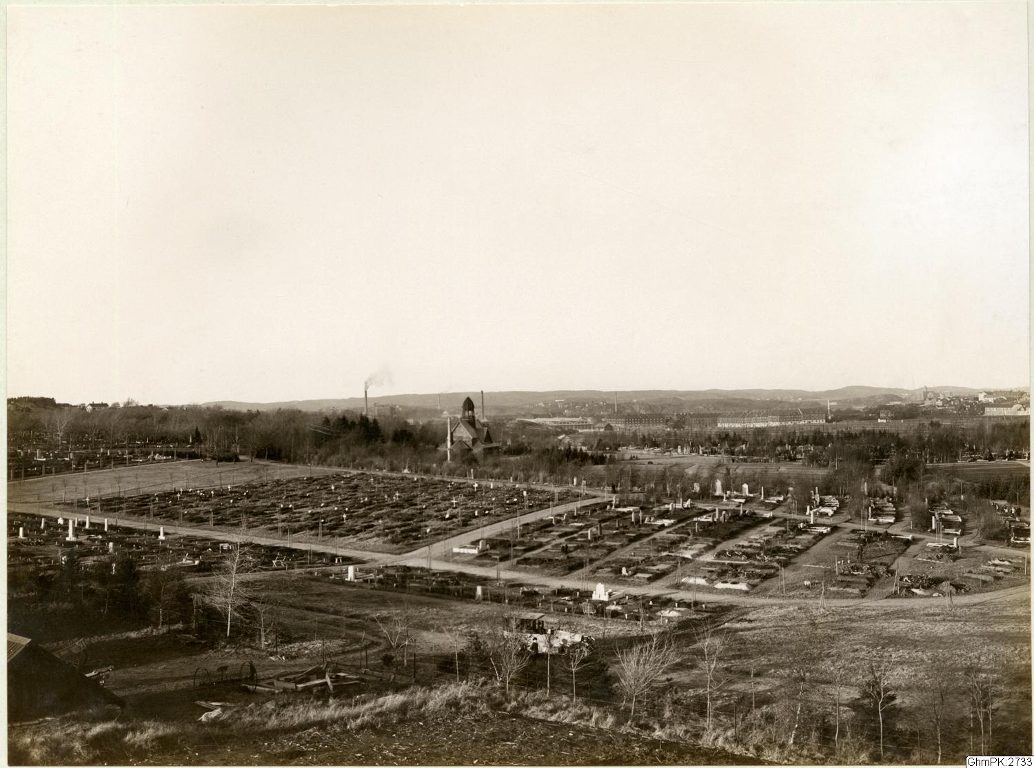 - Vy över Västra kyrkogården mot nordost. I fonden, mitt i bild kapellet och till höger Kungsladugård