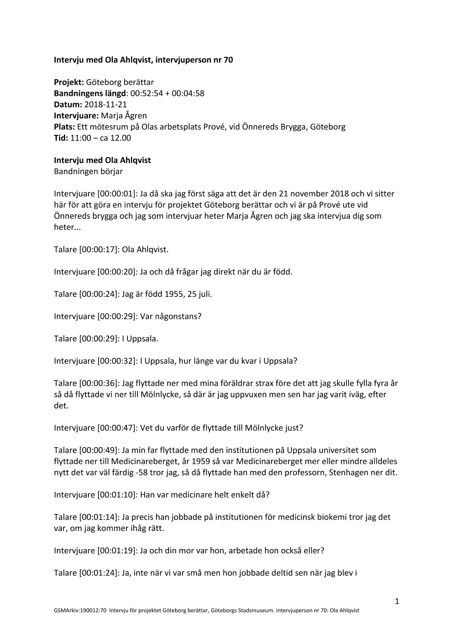 Ola har arbetat hos flera arbetsgivare under åren och även varit iväg utomlands i omgångar. Han gillar förändringar och att röra på sig. Nu arbetar han på en firma, Prové AB, som ägnar sig åt affärsutveckling och organisationsförändringar, både för privata företag och för offentlig verksamhet. Viktigt att ha ett bra nätverk, egentligen finns det bästa nätverket för honom fortfarande i Stockholm, där han läste. En del av göteborgsandan gör det svårt för Stockholmsföretag att etablera sig i Göteborg.