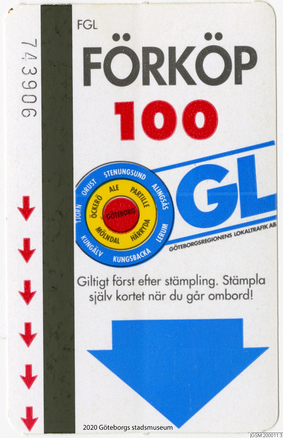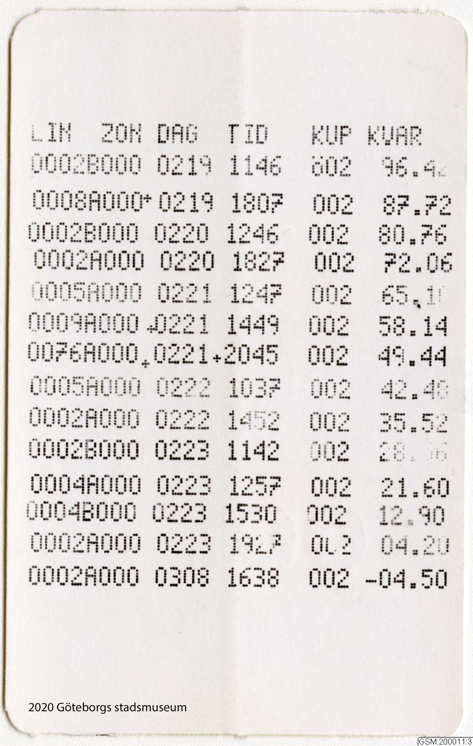 - Magnetkort från Göteborgsregionens lokaltrafik. Användes som betalningsmedel under 1990-talet på spårvagnar och bussar.
