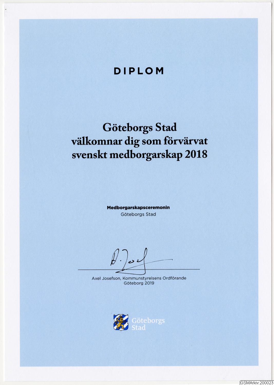 - Diplom i A4 av den typ som överlämnas av Göteborgs stad till kommuninvånare som blivit nya svenska medborgare. Utdelas vid medborgarskapsceremonin i Göteborg. Underskrift av Axel Josefson kommunstyrelsens ordförande i Göteborg.
