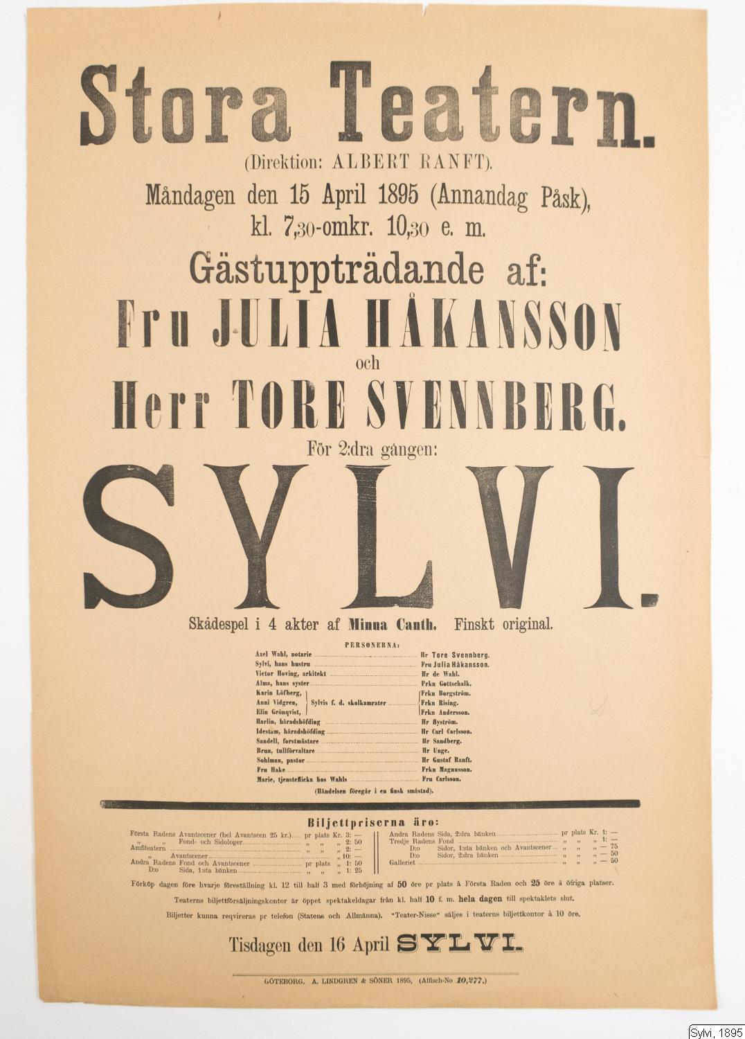 Affisch för Stora teaterns uppsättning av Sylvi 16/4 1895.