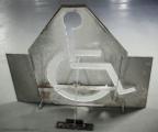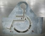 Schablonen är i metall med en handikappsymbol. Den har suttit fastmonterad i underredet på en skåpbil.