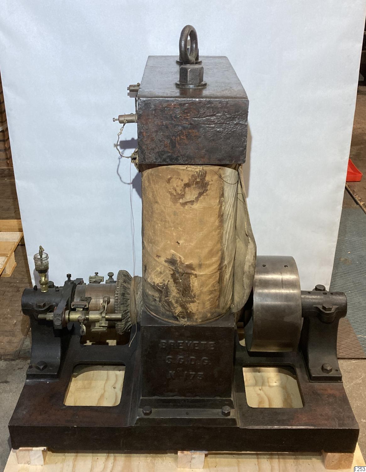 Elektrisk dynamo, eller likströmsgenerator av en typ som på 1880-talet konstruerades av Edison. Med två stående stora spolar. Var med på jubileumsutställningen 1923. På ena kortsidan står: BREVETE, S.G.D.G., No 173. På andra kortsidan står: SOCIETE, IND ELLE 8 COMM LE, EDISON PARIS. Hör ihop med I:252, en tvillingångmaskin.