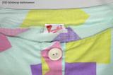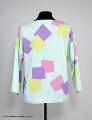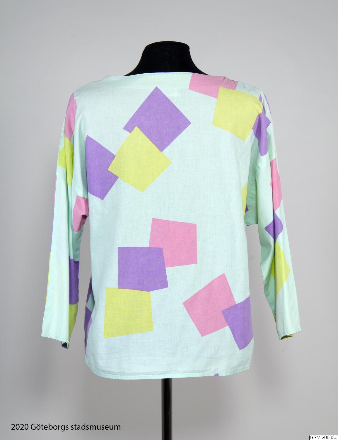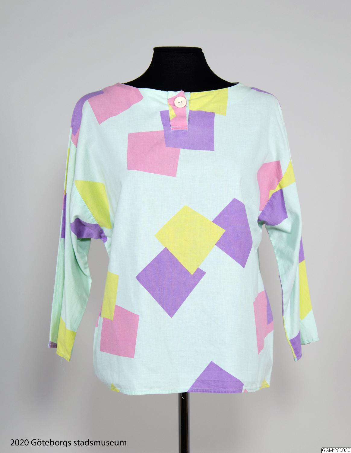 Mintgrön bomullsblus med båtringning och trekvartslång ärm. Mönster av stora oordnade geometriska figurer i pastellgult, lila och pastellrosa. Knäppning med en stor ljusgul plastknapp i halsen.