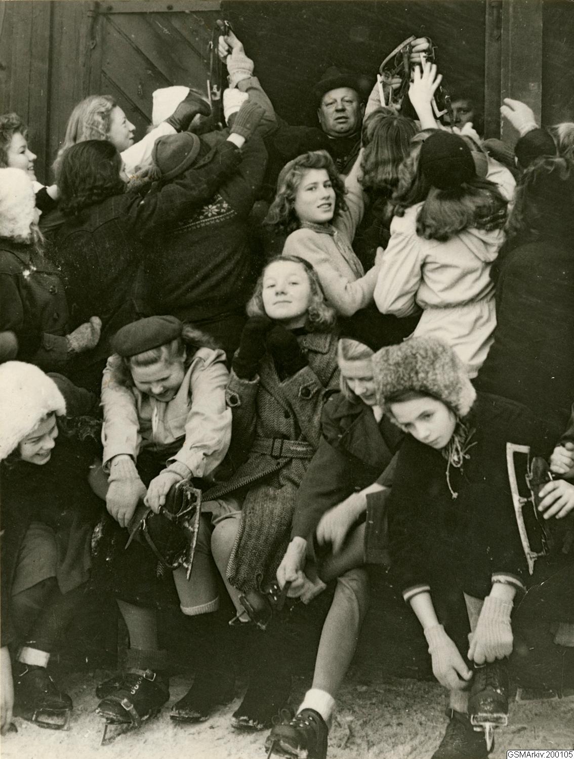 Utlåning av skridskor från Idrottsgården. Bilden publicerad i Göteborg av idag, nr 1 februari 1946 till sammans med en artikel " Vintersport för skattepengar"