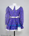 - Barnklänning i lila bomullstyg med mönster av små barnfigurer i brunt, turkost och vitt. Klänningen har en vit spetsig utanpåliggande krage i vit bomull med vågig kant och broderier längs kanten i vitt. Klänningen har lång puffärm med rynkad volang vid ärmsluten. Den är avskuren i midjan som är markerad med ett vitt skärp i plast med vitt spänne. Kjolen är vid och har en påsydd rynkad volang i nederkant som markeras av ett påsytt turkost satinband. Volangen är fodrad med vitt bomullstyg med påsydd spetskant som sticker fram nedanför volangen. Kjolen har en fastsydd tyllunderkjol som ska ge den lite extra vidd. Knäppning med dragkedja mitt bak.