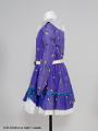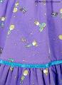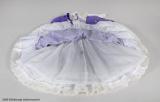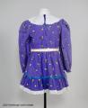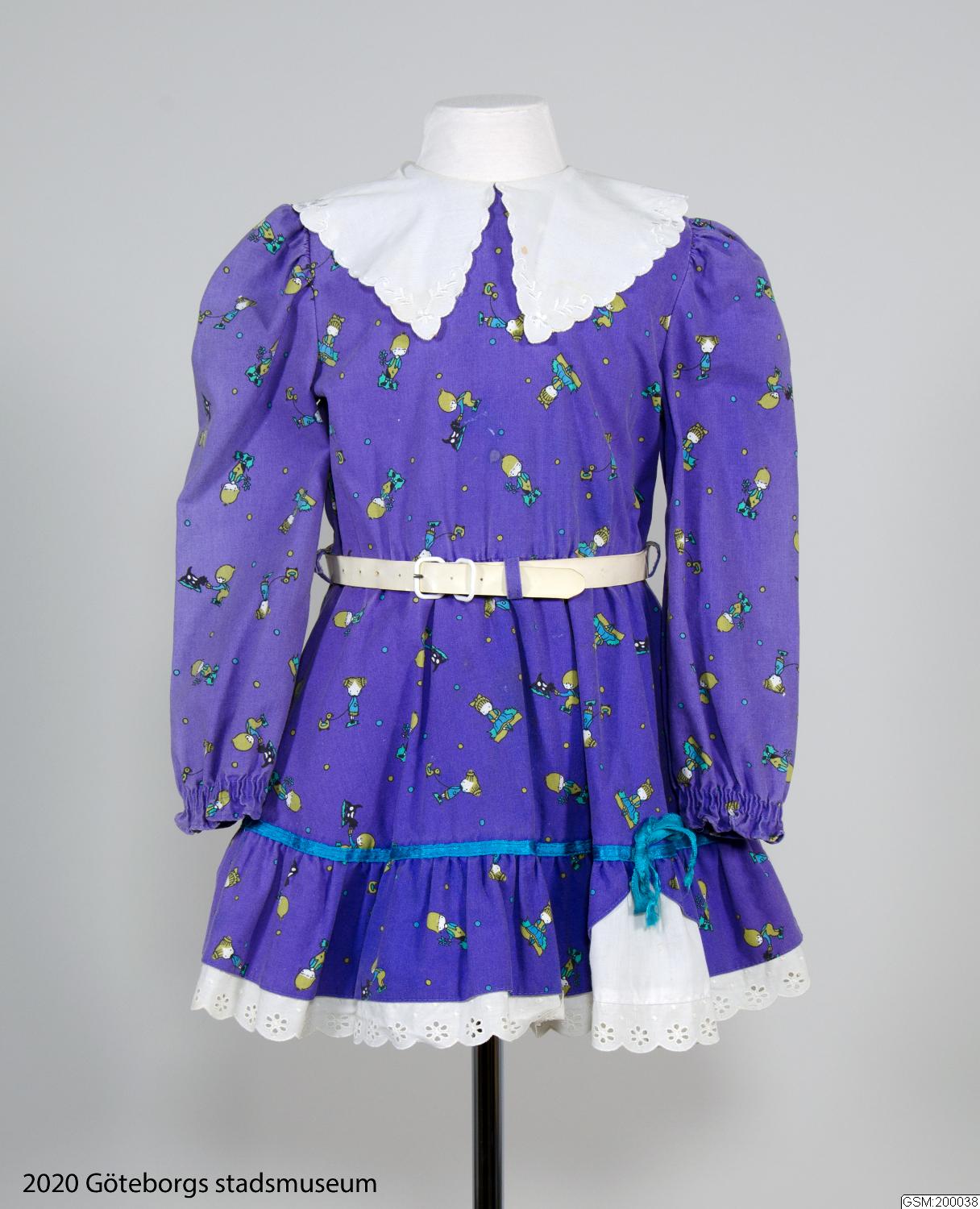 - Barnklänning i lila bomullstyg med mönster av små barnfigurer i brunt, turkost och vitt. Klänningen har en vit spetsig utanpåliggande krage i vit bomull med vågig kant och broderier längs kanten i vitt. Klänningen har lång puffärm med rynkad volang vid ärmsluten. Den är avskuren i midjan som är markerad med ett vitt skärp i plast med vitt spänne. Kjolen är vid och har en påsydd rynkad volang i nederkant som markeras av ett påsytt turkost satinband. Volangen är fodrad med vitt bomullstyg med påsydd spetskant som sticker fram nedanför volangen. Kjolen har en fastsydd tyllunderkjol som ska ge den lite extra vidd. Knäppning med dragkedja mitt bak.