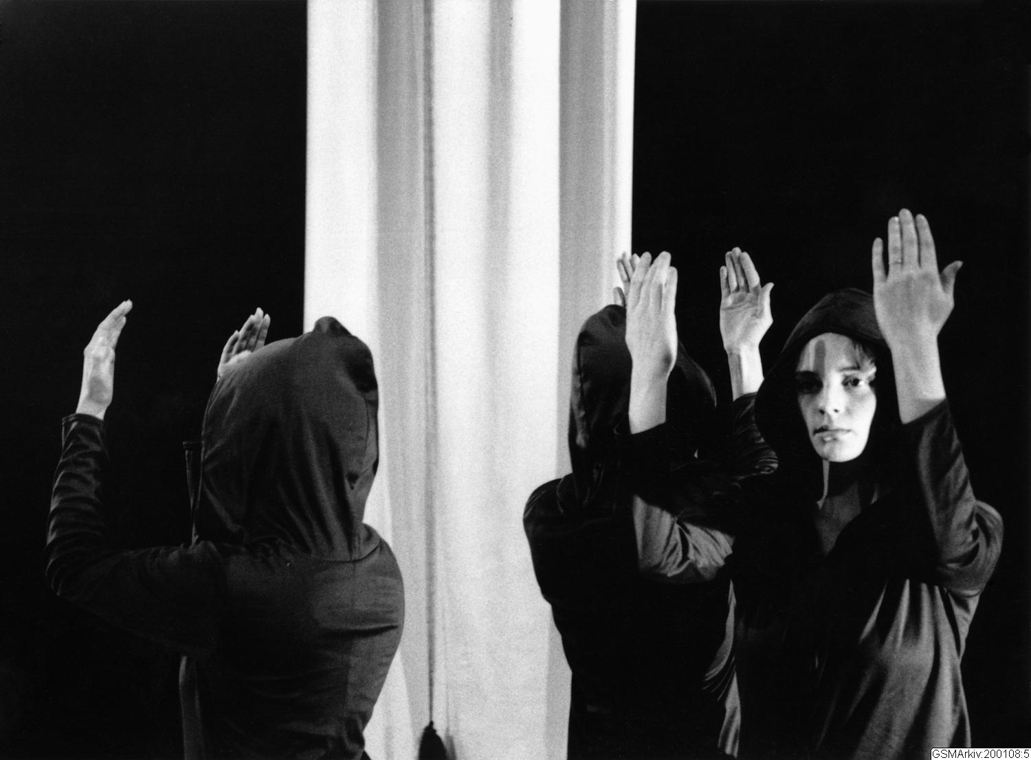 Fotografi från dansverket Rävarnas bröllopsdans, 1991. Verket ingick i helaftonsföreställningen "Två Vägar" tillsammans med Lycke Liten och spelades på Unga Atalantes scen.