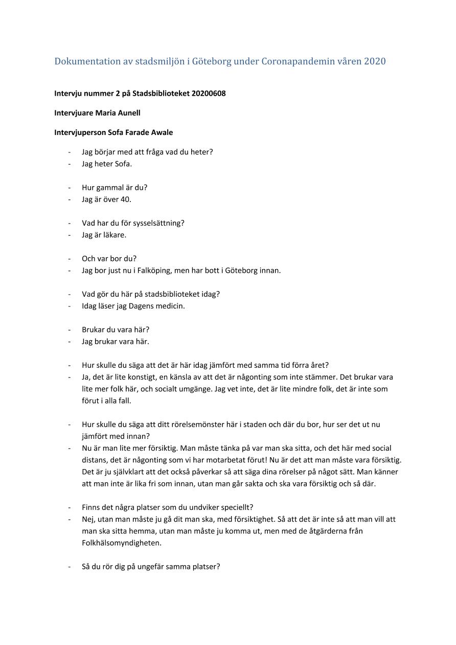 Intervju utförd som en del i dokumentation av stadsmiljön i Göteborg under Coronapandemin våren 2020
