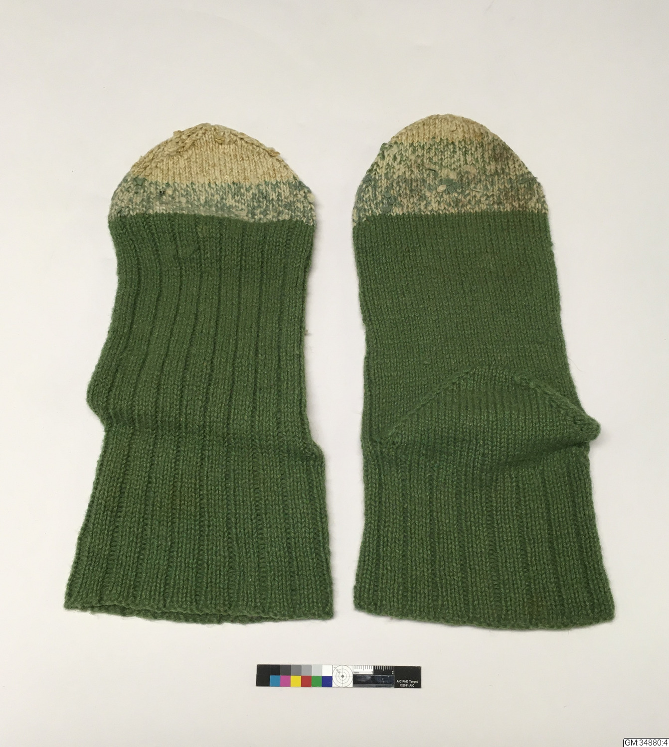 : 4-5) Ett par hemstickade tumvantar av grönt yllegarn med mönstereffekt på ovansidan och slät- och resårstickning för övrigt.