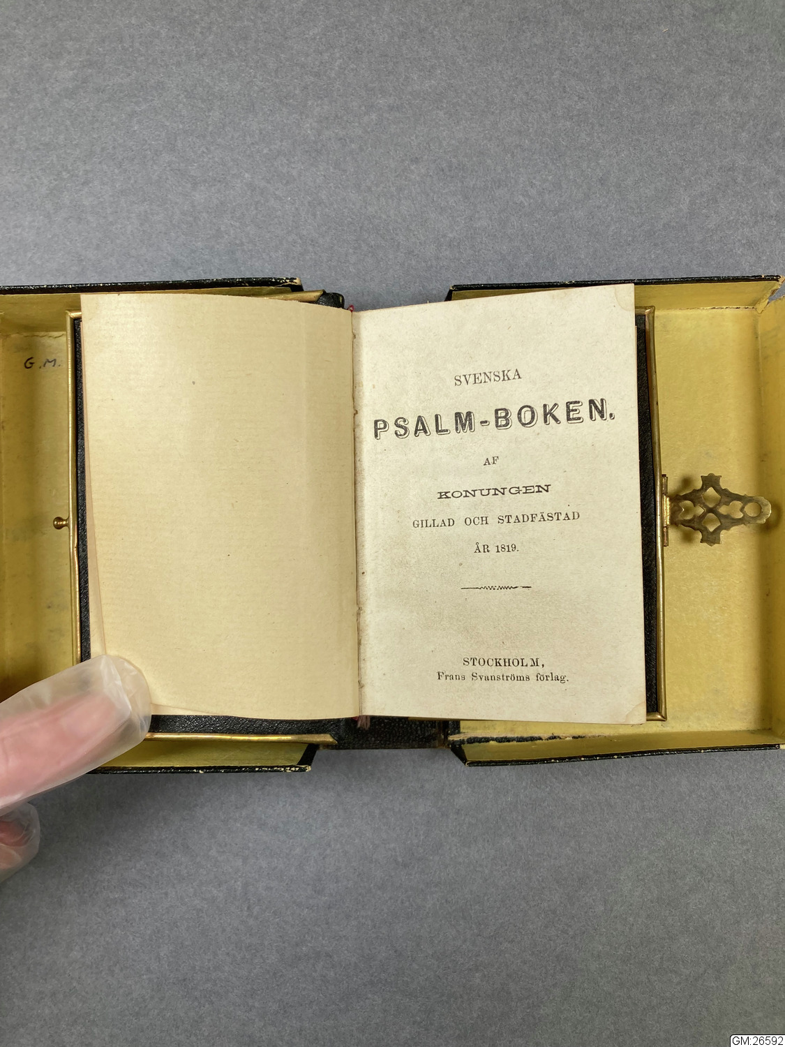 Psalmbok, klotband, svart med mässingskanter och spänne. Guldsnitt. Pappfodral.#Tillhör GM 26 589-591.