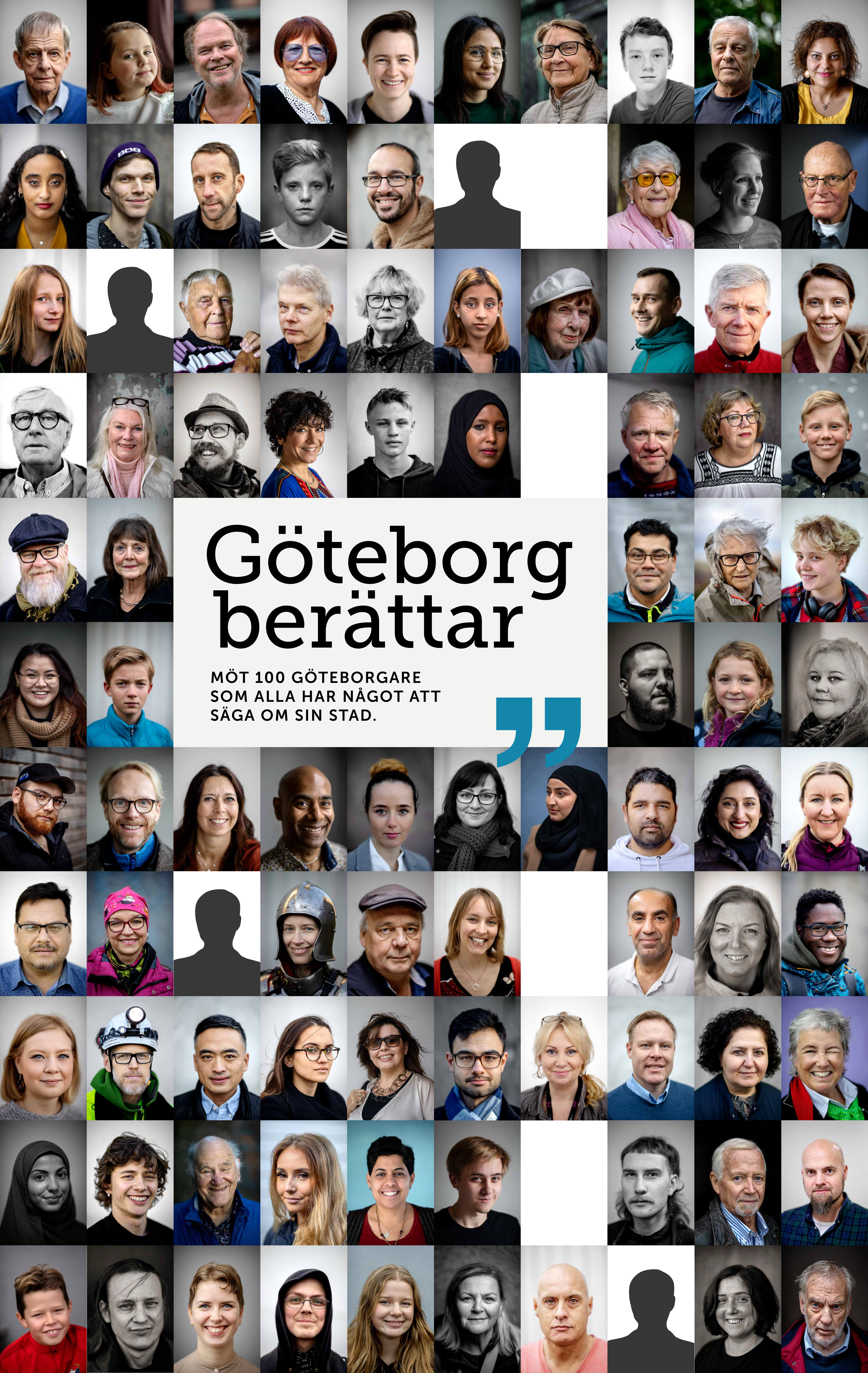 Som en del av stadens 400-årsjubileum har Göteborgs stadsmuseum gjort hundra intervjuer med hundra göteborgare. De personliga berättelserna finns nu sparade i museets arkiv. Våren 2021 tar dessa människor plats i centrala Göteborg, i en stor utomhusutställning. Möt kvinnor och män, gamla och unga, infödda och nyanlända, med alla möjliga sysselsättningar och från olika delar av staden. Deras röster och porträtt ger en bild av Göteborg idag, men berättar också om sådant som varit och vad som kan bli. Varje uttalande öppnar en möjlig berättelse om Göteborg, och tillsammans bildar de en historia.