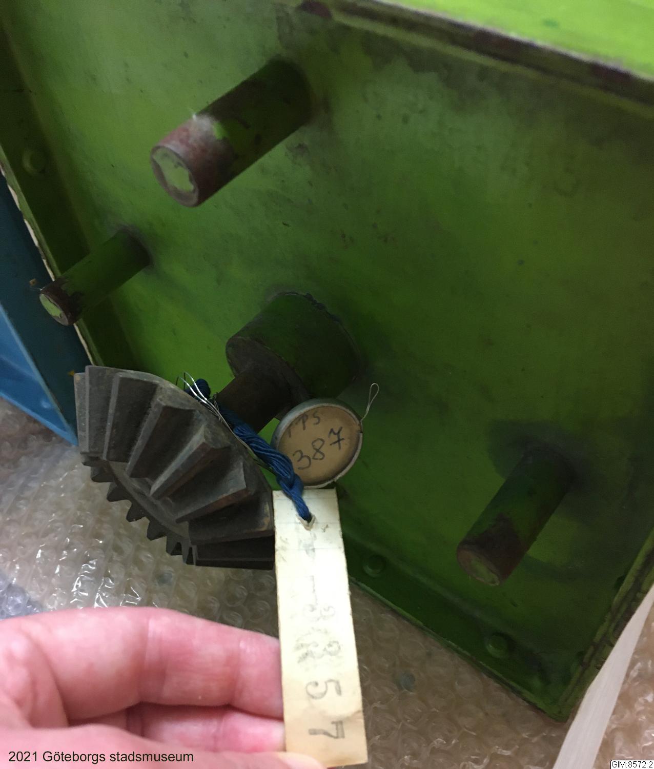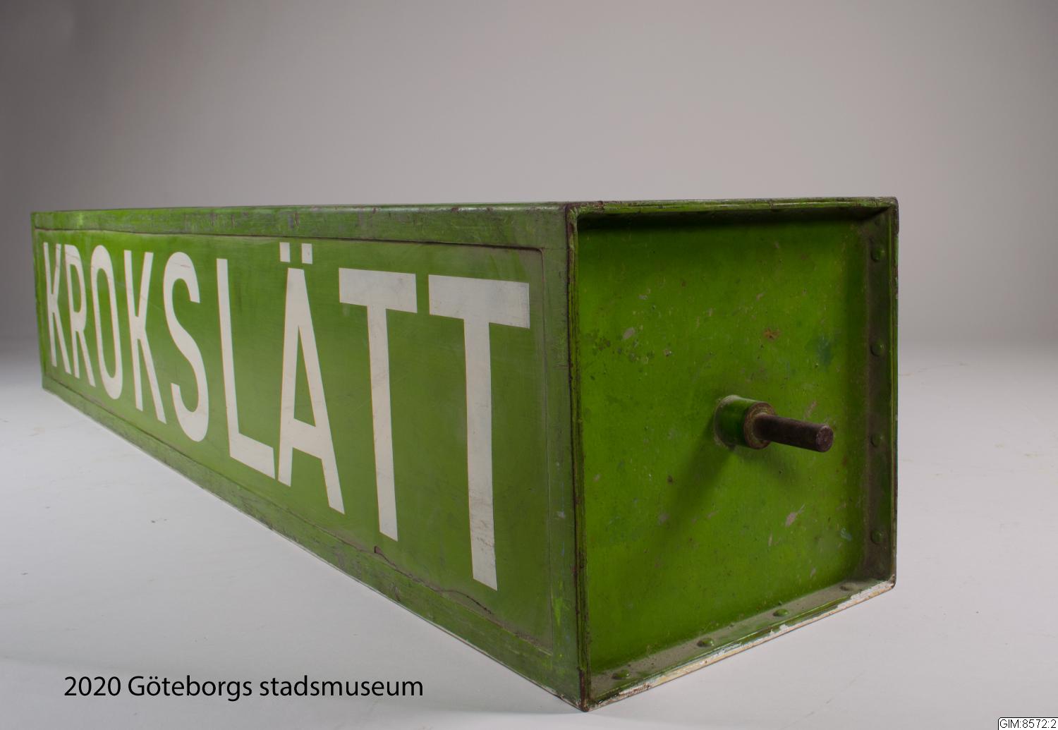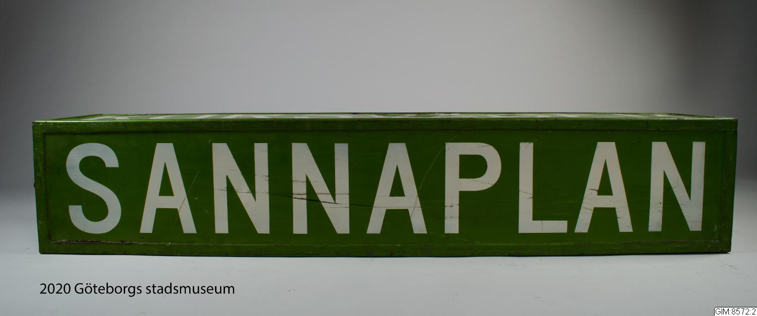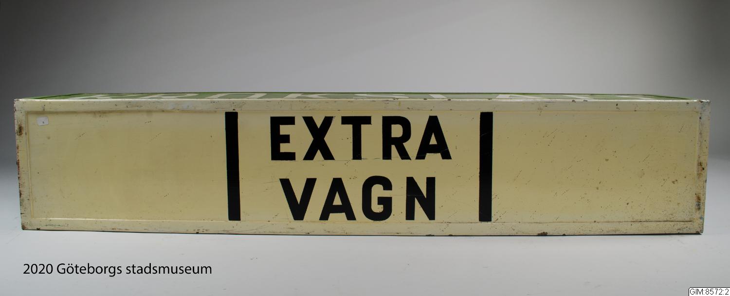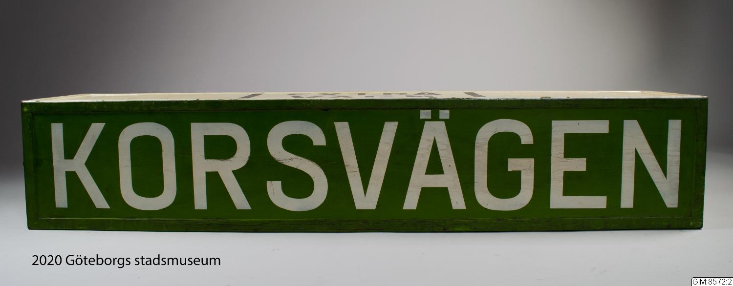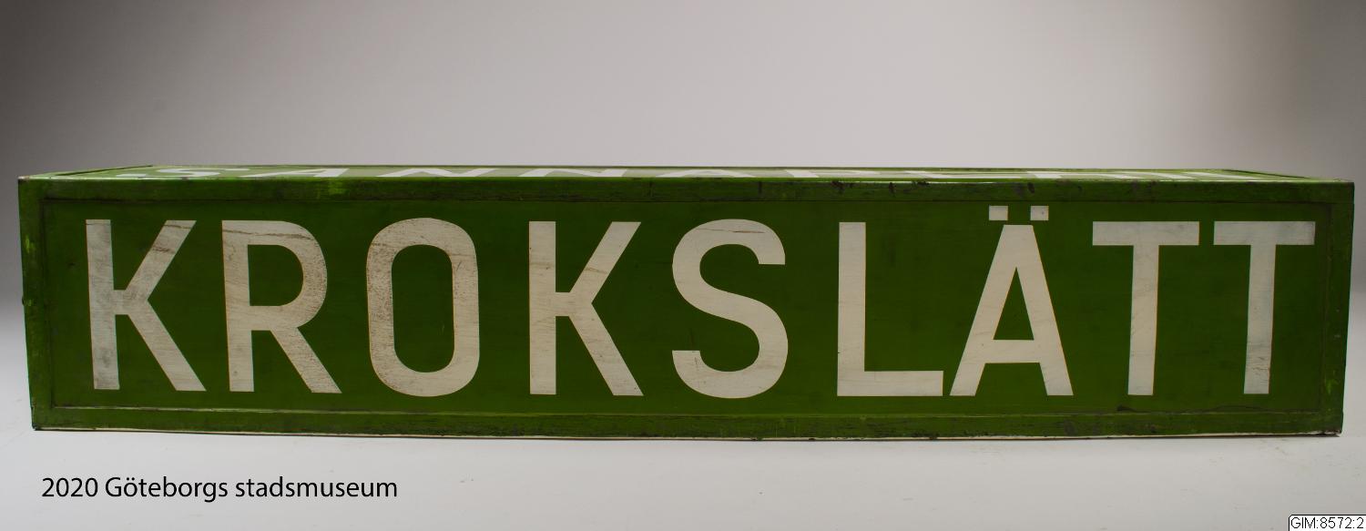 - Takskylt för spårvagn fram och bak, gröna linjen. Fyrsidig, grön med vit versal text på tre sidor: "Korsvägen", "Sannaplan", "Krokslätt" samt en sida vit med svart text "Extra vagn"