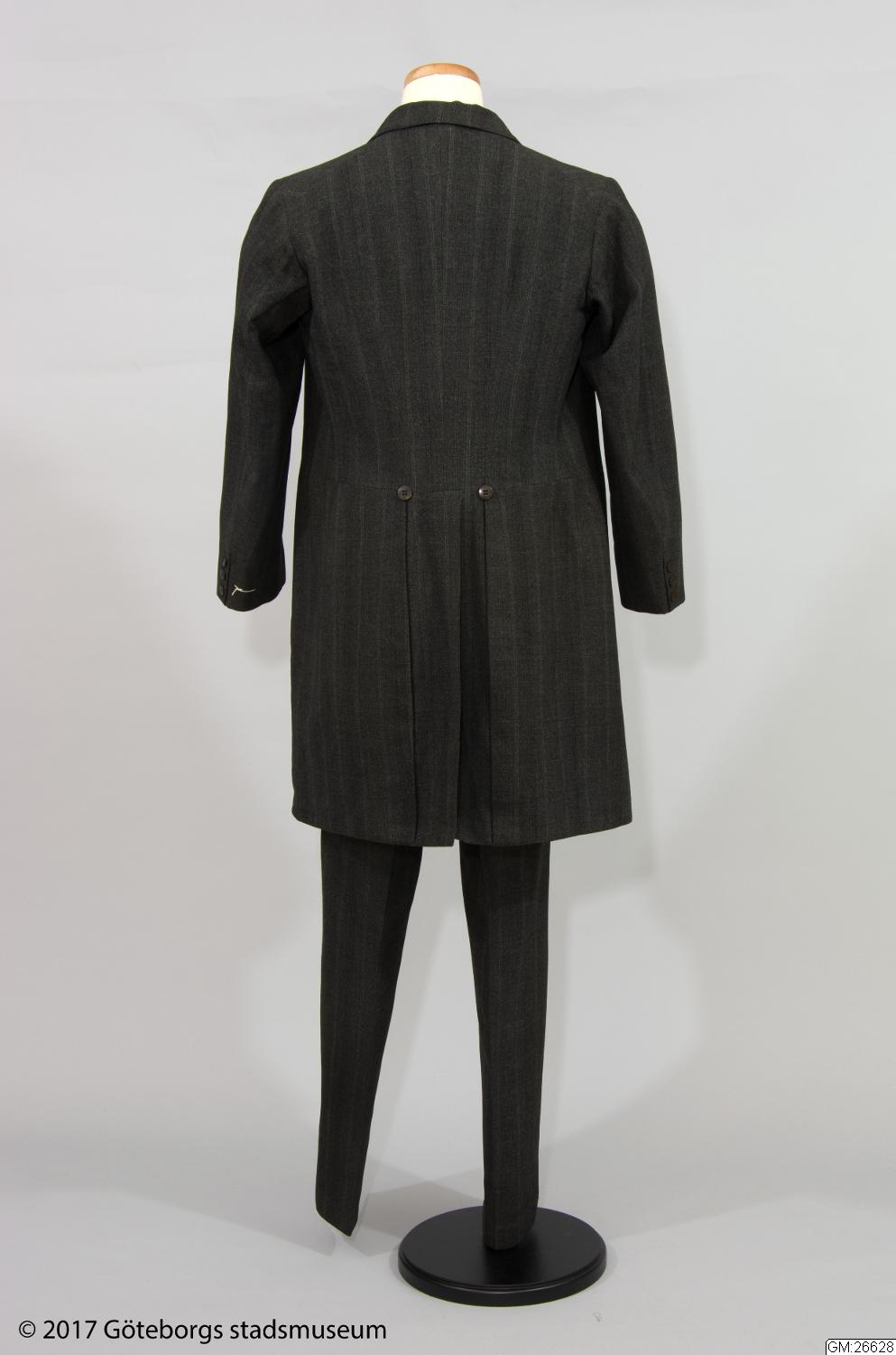 Kostym bestående av bonjour, väst och byxor av grårandigt ylletyg.