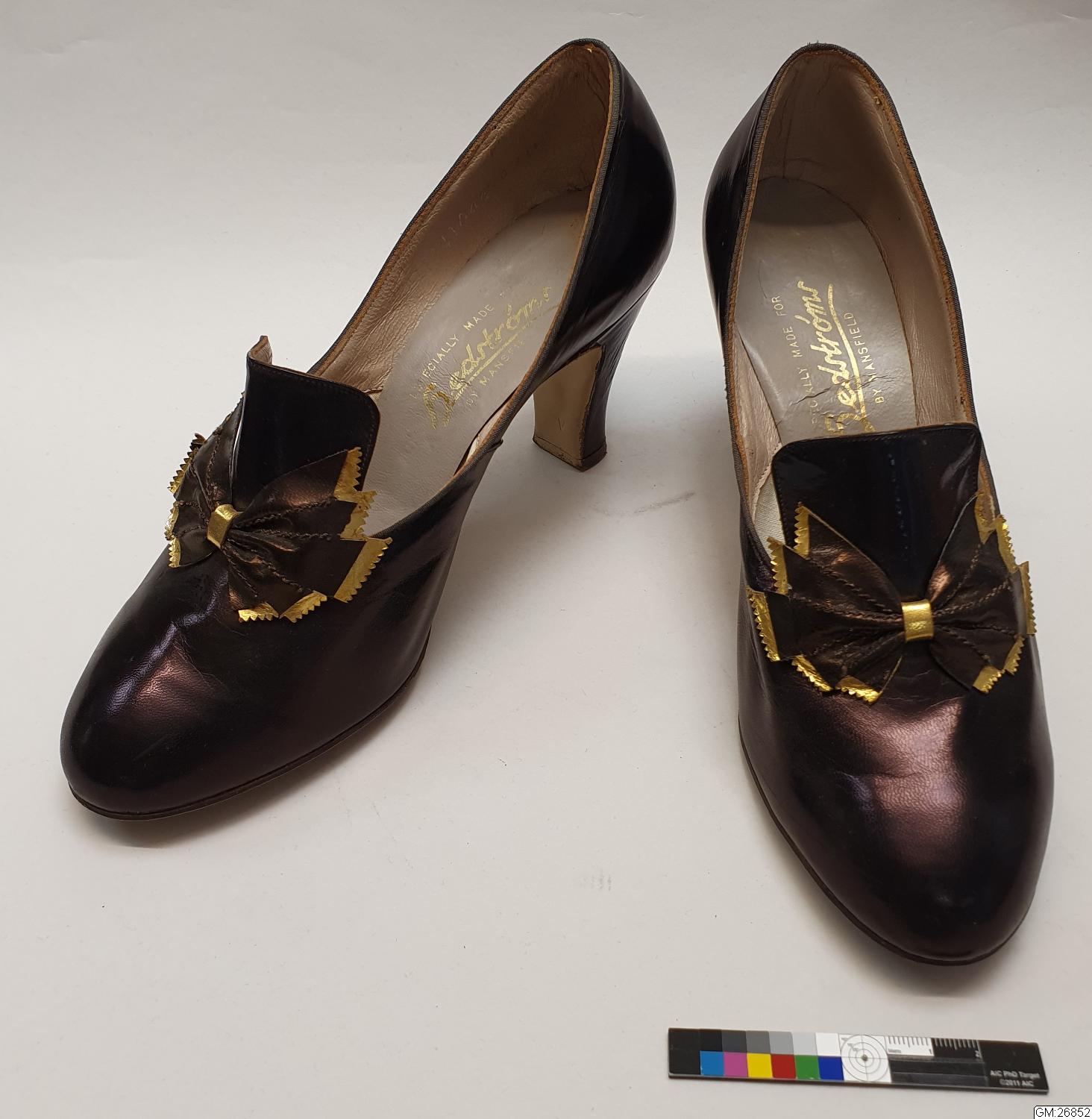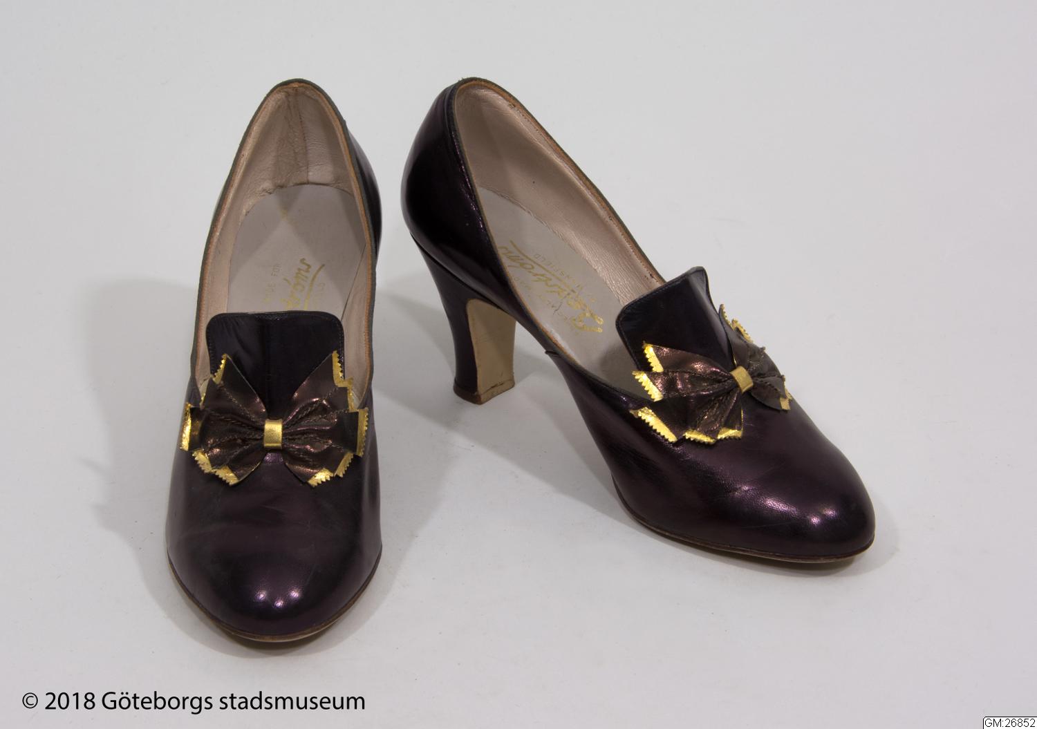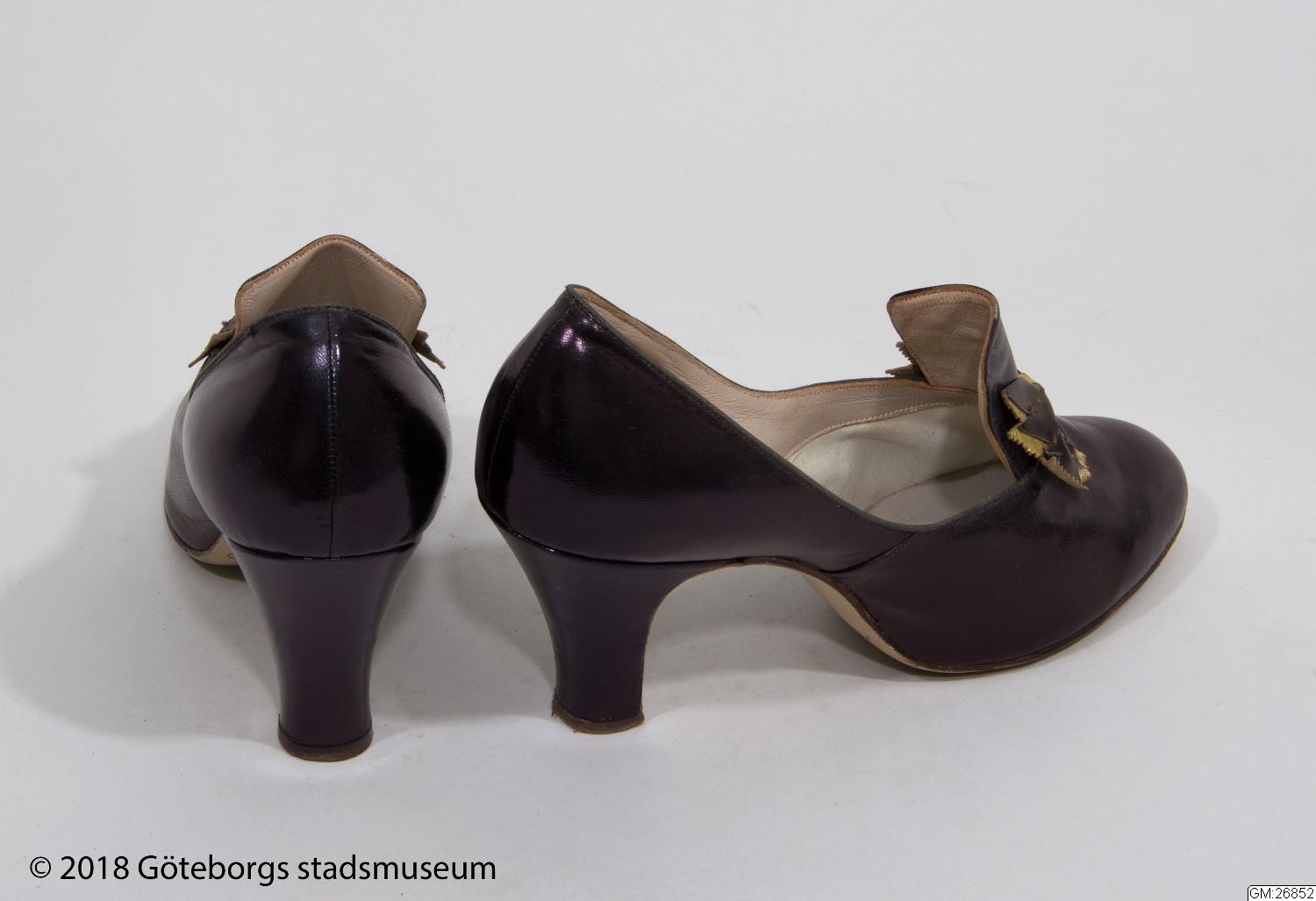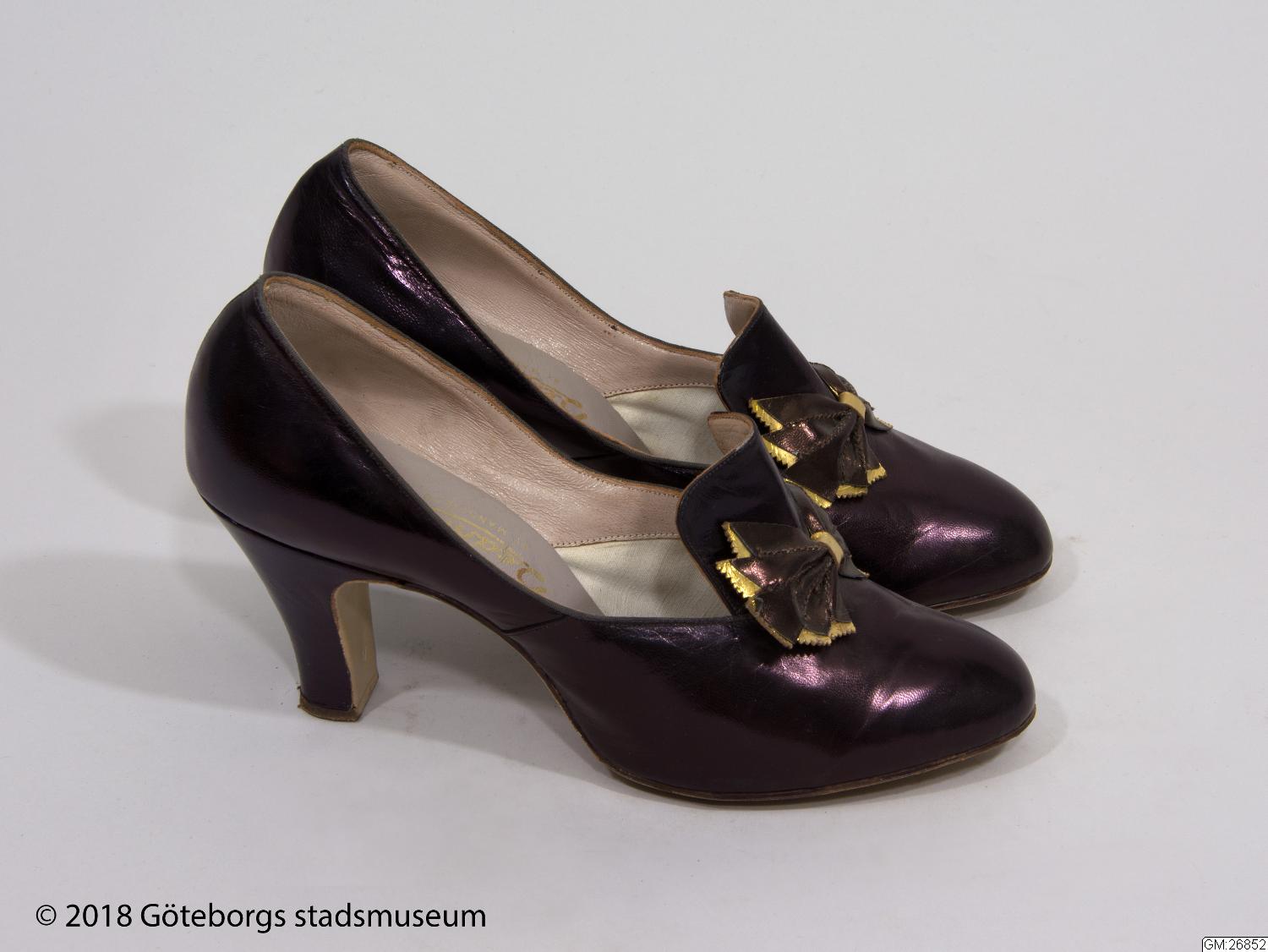 Damskor,ett par, av brun chevrå. Pumpsmodell med hög klack. Plös framtill med rosett. Fodrade. "Especially made for Hedströms...2