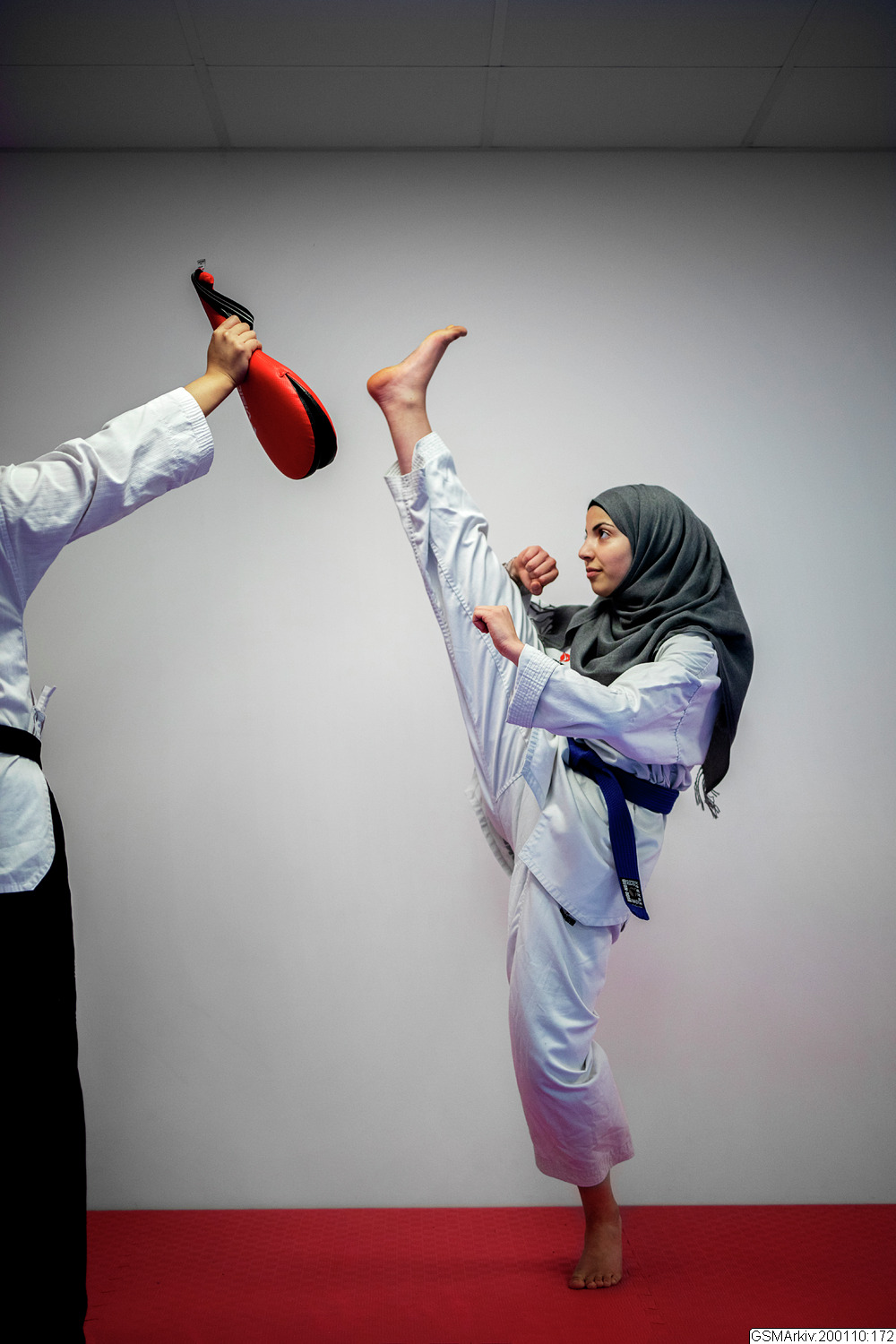 Hadia Khalid under taekwondoträning hos Taekyon Taekwondo Gunnilse.