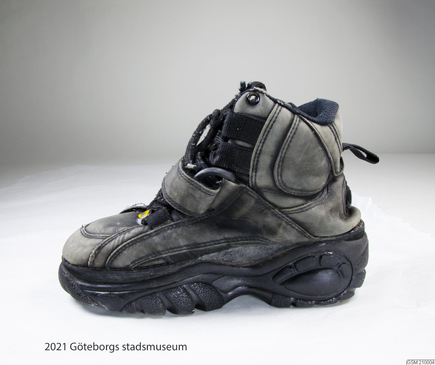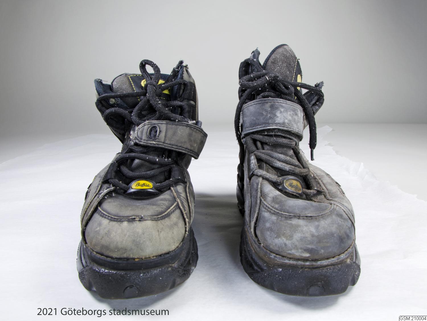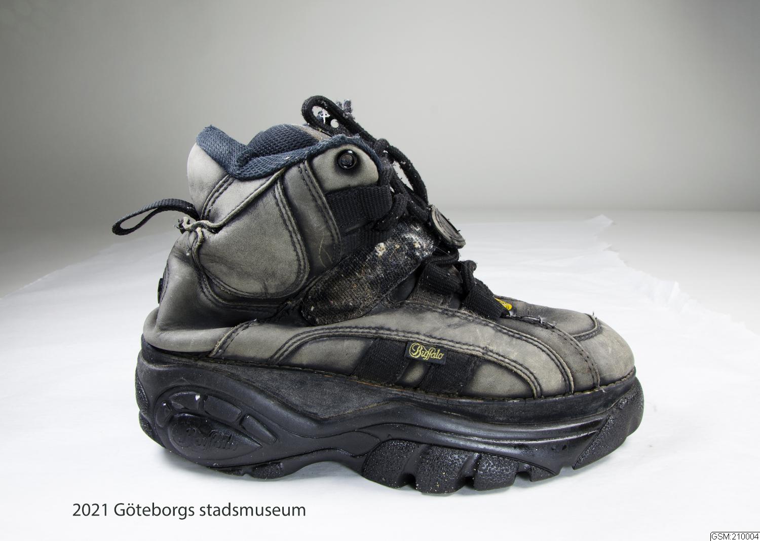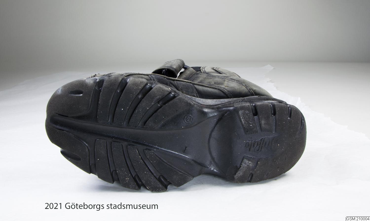 Buffalo shoes - Belonged to Babak Hashemi, born in 1983. Babak did not survive the party evening. He is buried at Kviberg cemetery together with nine friends who all died that night. Buffalo shoes were iconic footwear in the late 1990s, reflecting young people’s striving for uniformity whatever their background. Babak danced in these shoes on that fateful night. [The Thing about Gothenburg, 2021]